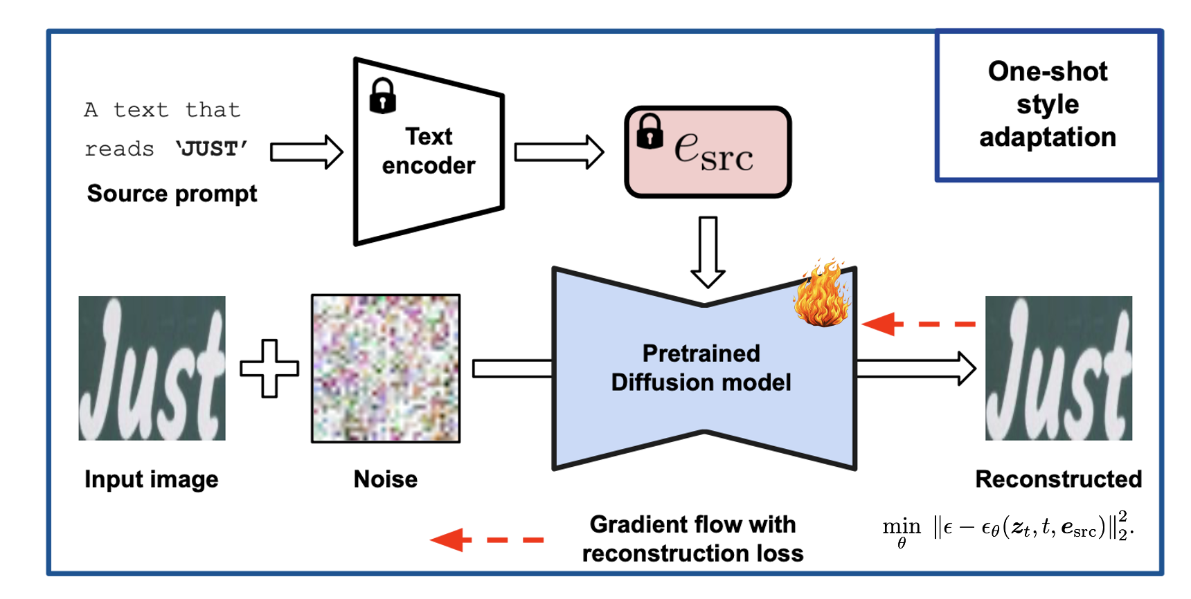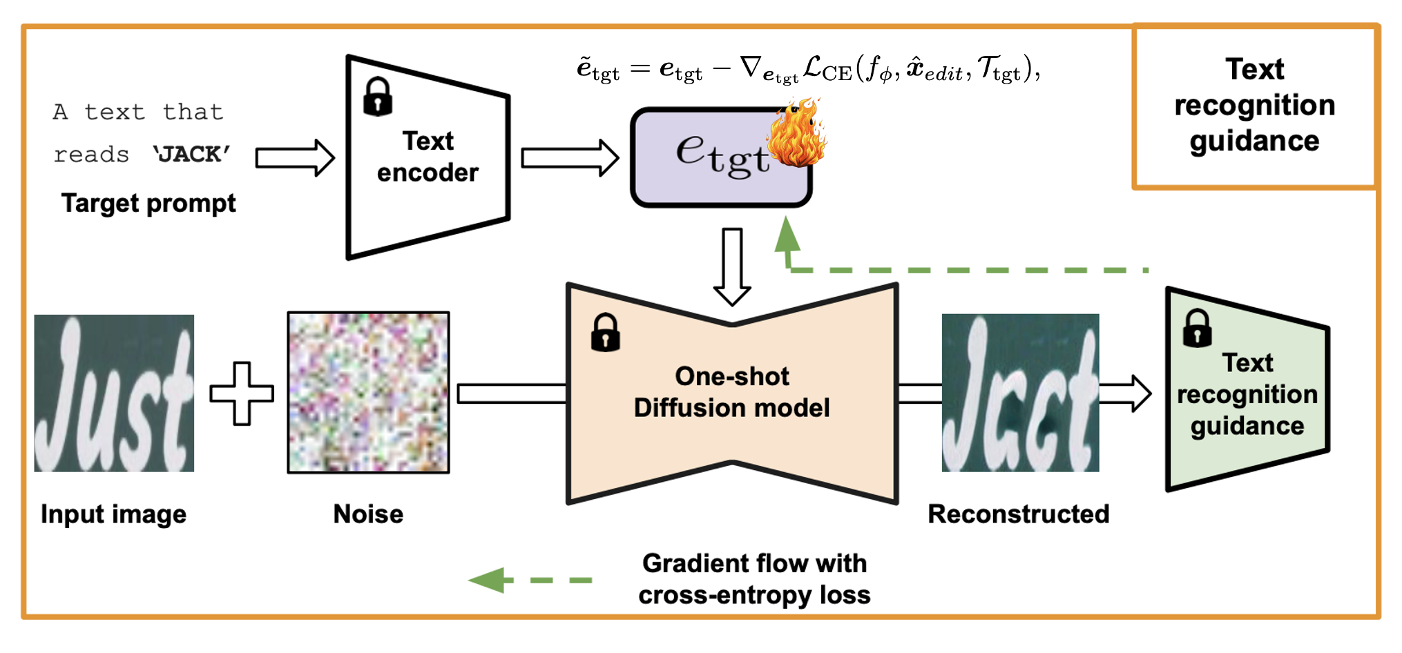 위에서 각 source image에 대해 fine-tuned 모델\(\tilde{\epsilon}\)이 있다고 하면, 저자들은 text recognizer를 이용해 \(e_{\text{tgt}}\) 를 optimize.