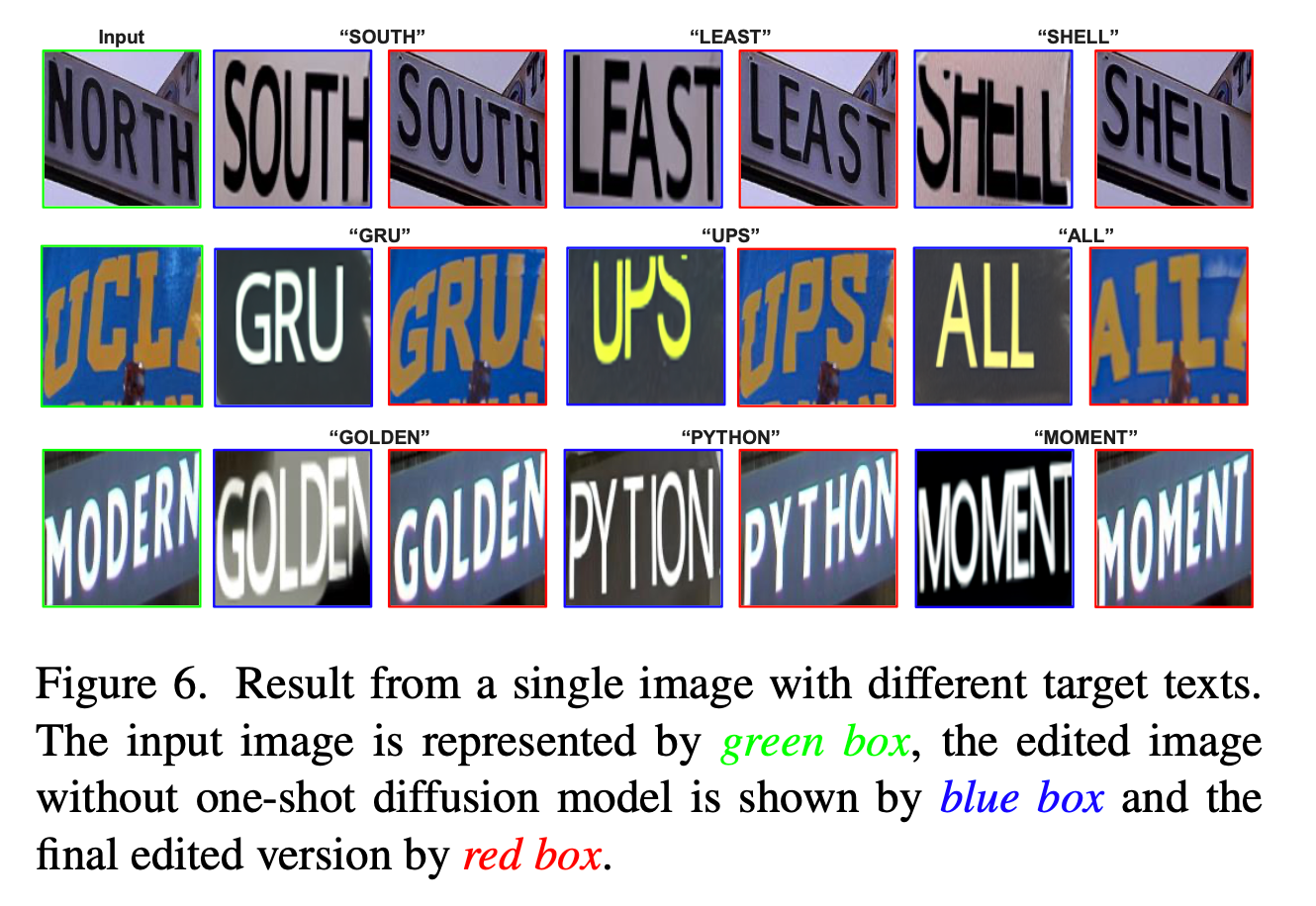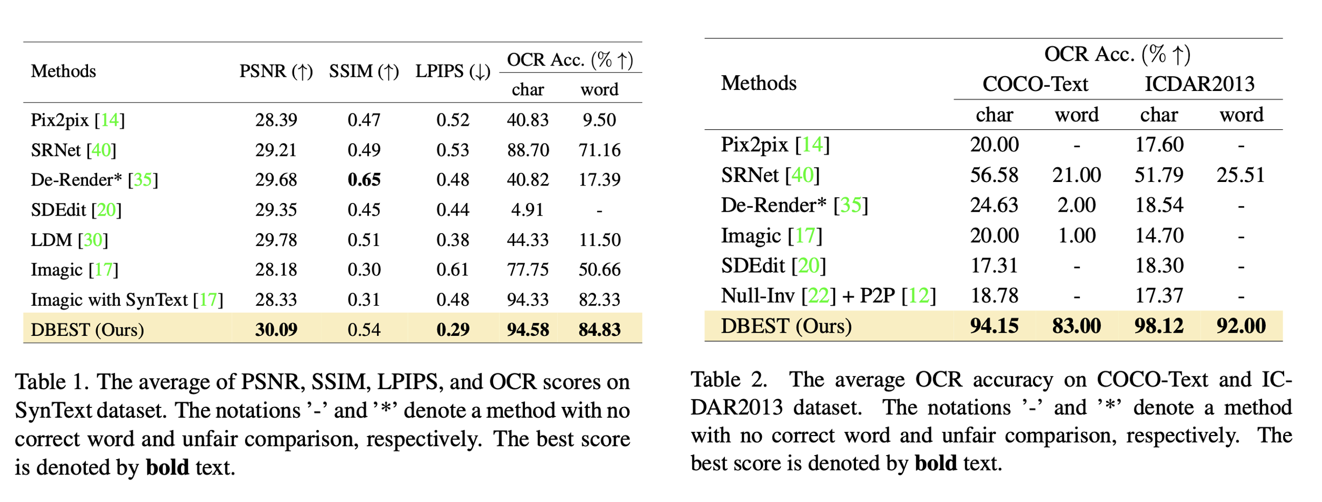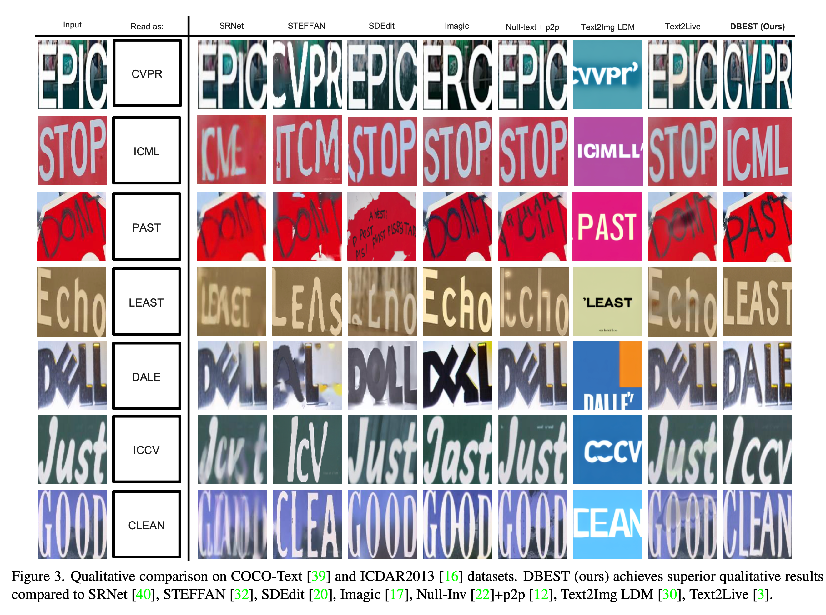 One-shot style adaptation, Text-recognition guidance를 이용한 Diffusion based scene text editing을 수행하는 DBEST 제안.