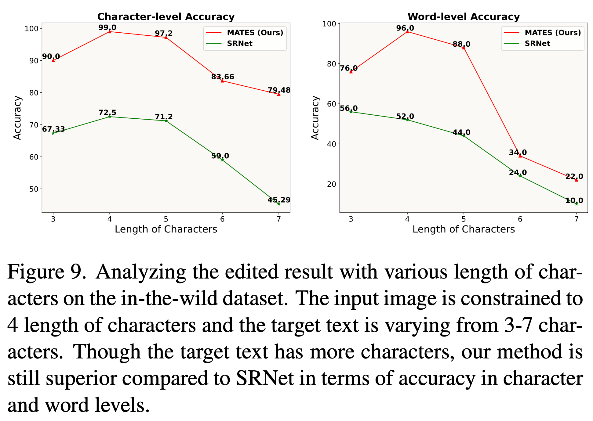• Length of characters 길이가 5를 초과할 때 성능이 크게 감소했는데, 이는 주어진 텍스트와 장면 내 사용 가능한 공간에 따라 폰트 크기를 조정할 능력 부족 때문으로 판단된다고 합니다.