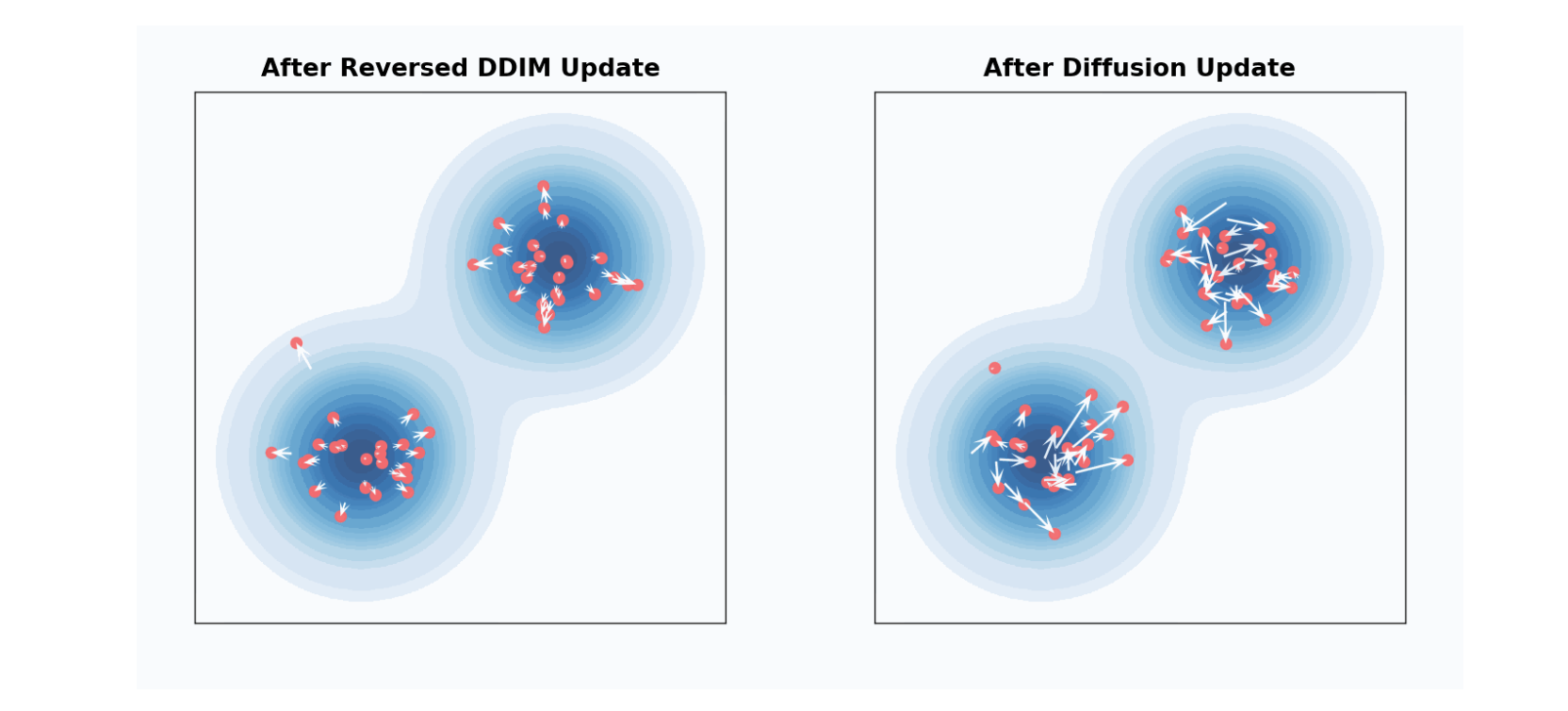 DDPM sampling step을 \(\lambda_t\)에서 \(\lambda_t + \Delta \lambda_t\)로 이동시키는 것은, \(\lambda_t + 2 \Delta \lambda_t\)까지 DDIM으로 이동시킨 다음, forward process로 noise를 추가하는 것과 \(\lambda_t + \Delta \lambda_t\) 동일합니다.