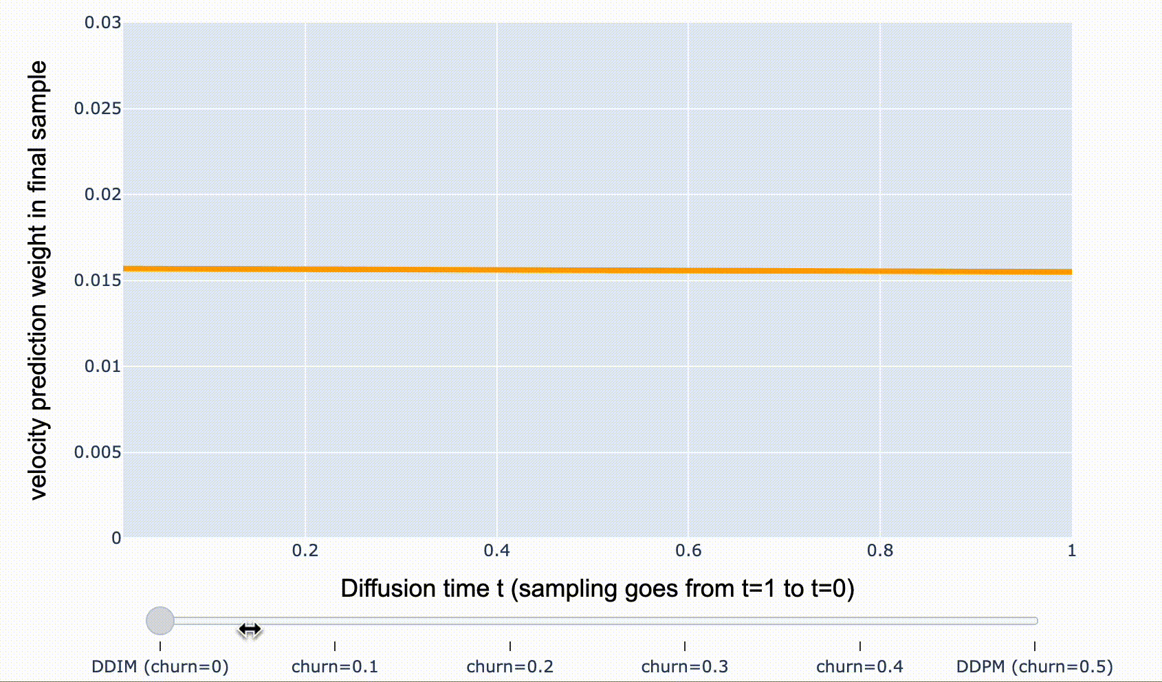 - DDIM( \(\text{churn}=0\)): \({\mathbf{v}}_t\)-prediction weight가 시간에 따라 균일