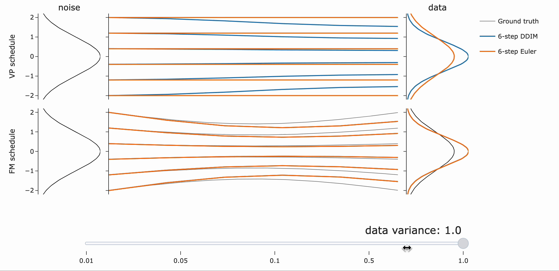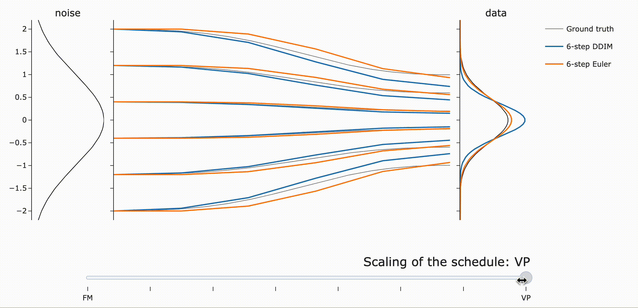 VP는 넓은 분포에 대해 더 나은 path (straighter)를 제공하는 반면, Flow matching은 좁은 분포에서 잘 동작한다는 점에 주목하라고 합니다.(?)