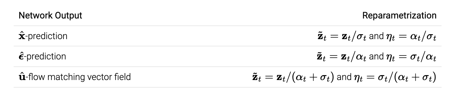 따라서 \(\hat{\bf v}\)과 flow matching vector field \(\hat{\bf u}\)에 적용되는, \(\hat{\bf x}\), \(\hat{\bf \epsilon}\)의 조합을 선택하는 것은 heuristic 하다고 합니다.