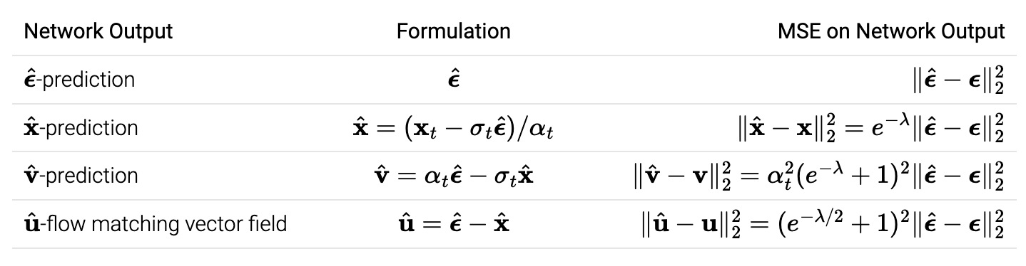 아래 표는 다양한 네트워크 출력을 요약한 것입니다. Training objective 관점에서 보면, 모두 \(\epsilon\)-MSE앞에 추가적인 가중치를 가지는 것이며, weighting function으로 표현할 수 있습니다.