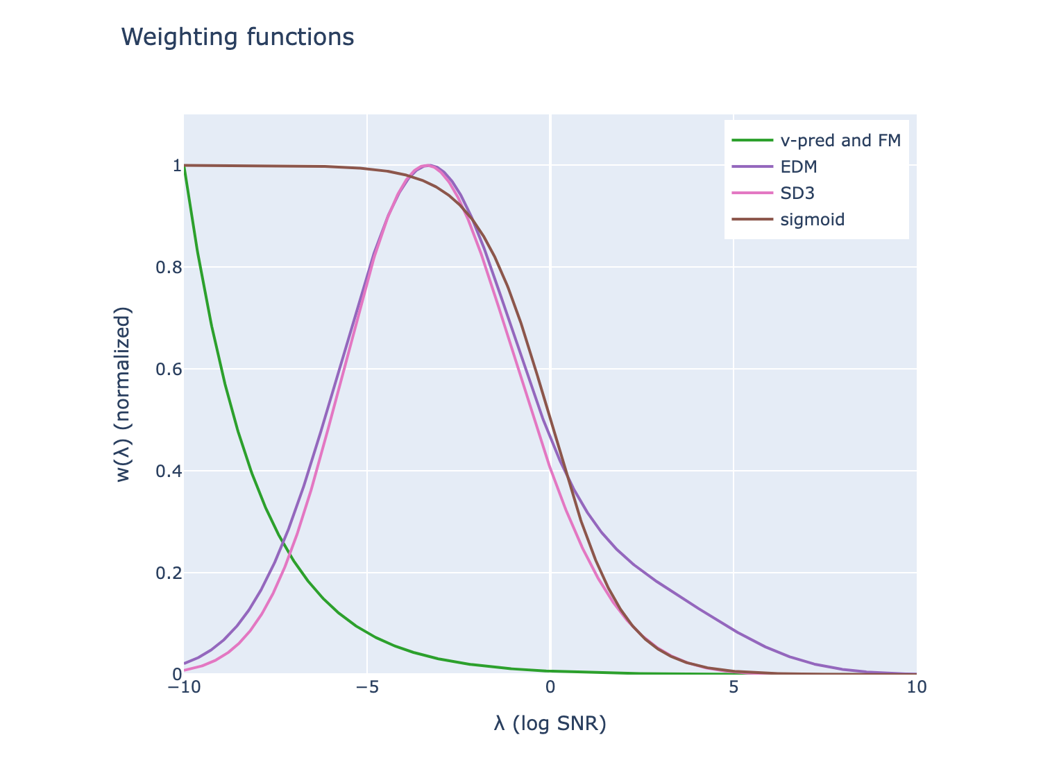 \[\mathcal{L}(\mathbf{x}) = \mathbb{E}_{t \sim \mathcal{U}(0,1), \boldsymbol{\epsilon} \sim \mathcal{N}(0, \mathbf{I})} \left[ \textcolor{green}{w(\lambda_t)} \cdot \frac{\mathrm{d}\lambda}{\mathrm{d}t} \cdot \lVert\hat{\boldsymbol \epsilon} - {\boldsymbol \epsilon}\rVert_2^2 \right],\]여기서 \(\lambda_t = \log(\alpha_t^2 / \sigma_t^2)\) log SNR이며, \(\textcolor{green}{w(\lambda_t)}\)는 loss의 균형을 맞춰주는 weighting function입니다. 이때 \(\mathrm{d}\lambda / {\mathrm{d}t}\)는 종종 weighting function에 합쳐지기도 하지만, design choic를 명확하게 하는데 도움이 되므로 disentangle 했습니다.