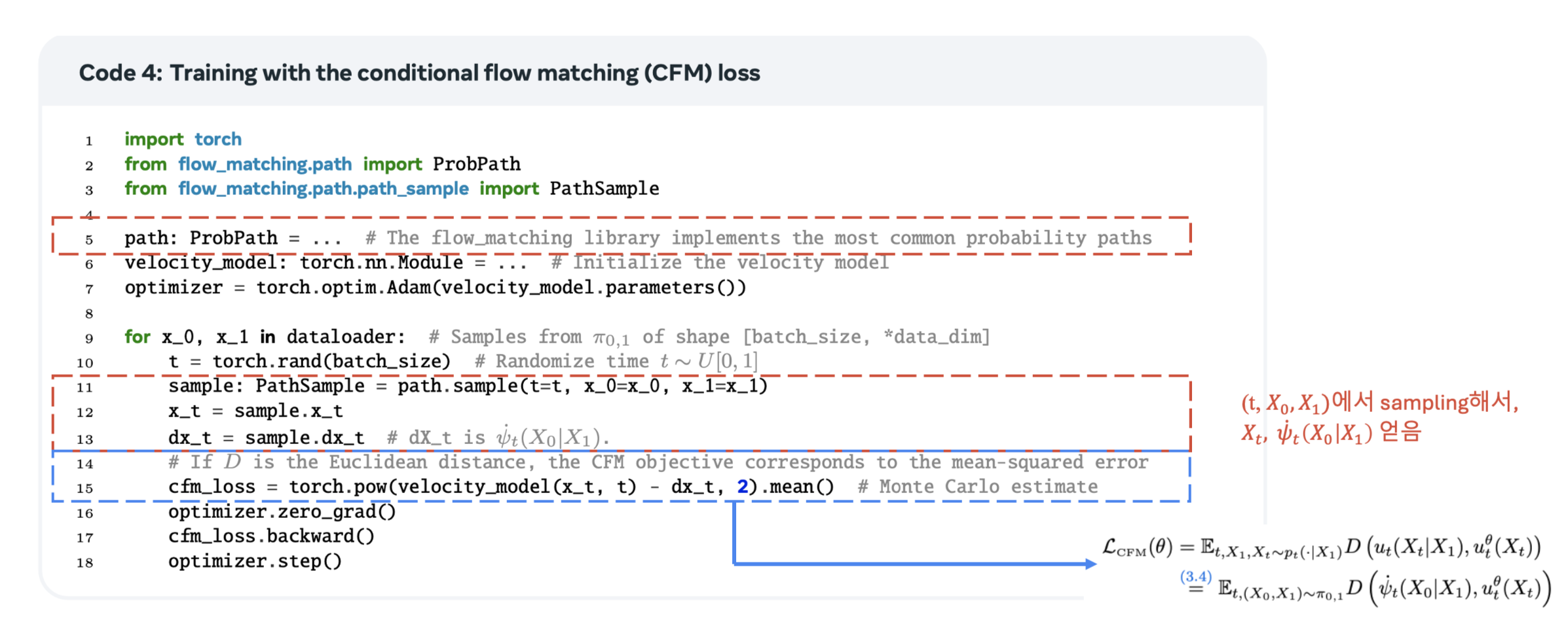 • Conditional Flow Matching (CFM) loss : \(\mathcal{L}_{\text{CFM}}(\theta) = \mathbb{E}_{t, Z, X_t \sim p_t|Z(\cdot | Z)} D(u_t(X_t | Z), u_t^\theta(X_t)).\)
