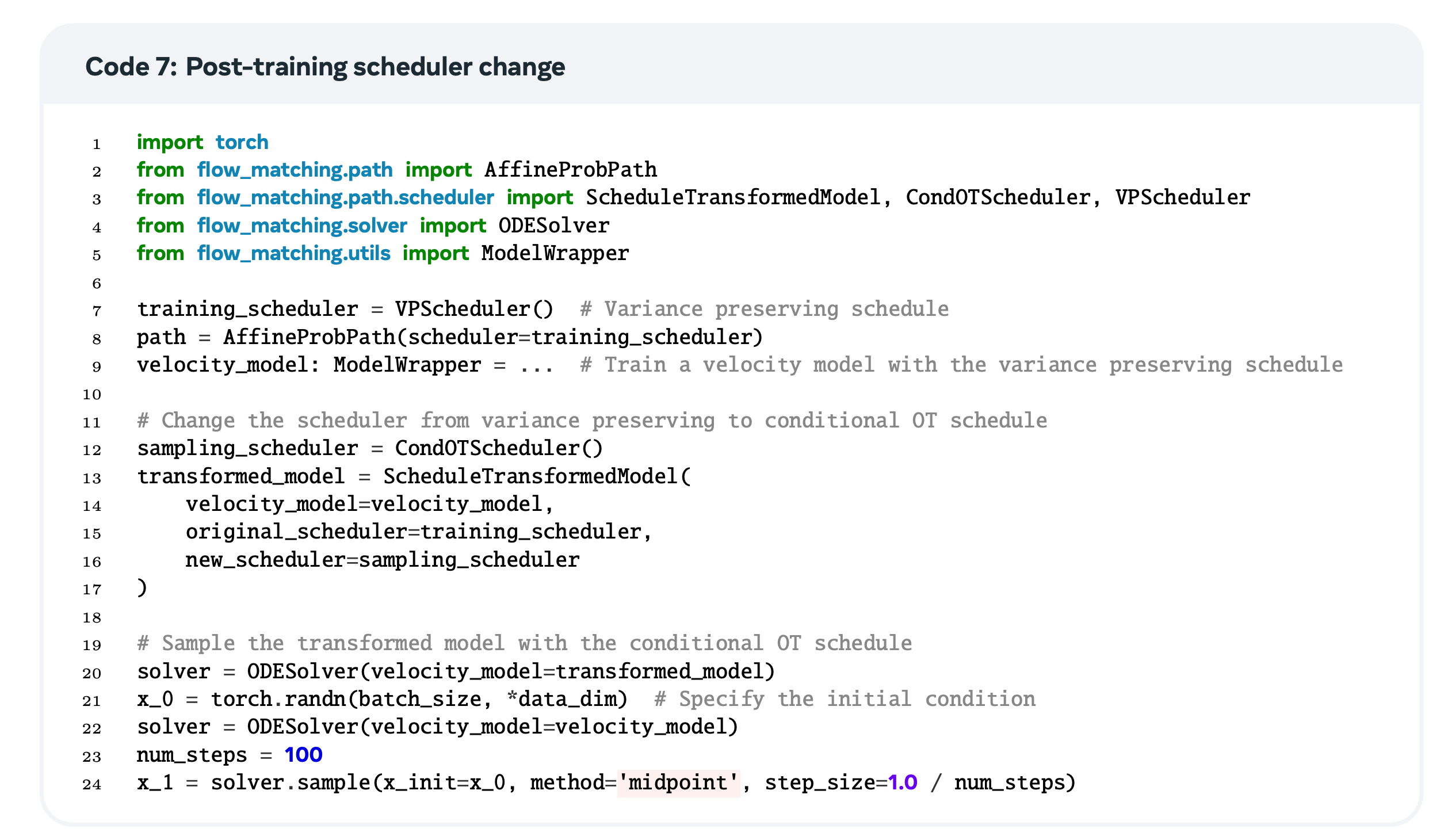 학습된 velocity field를 다른 scheduler로 바꾸어, 효율성을 높이거나, 생성 퀄리티를 높일 수 있습니다.