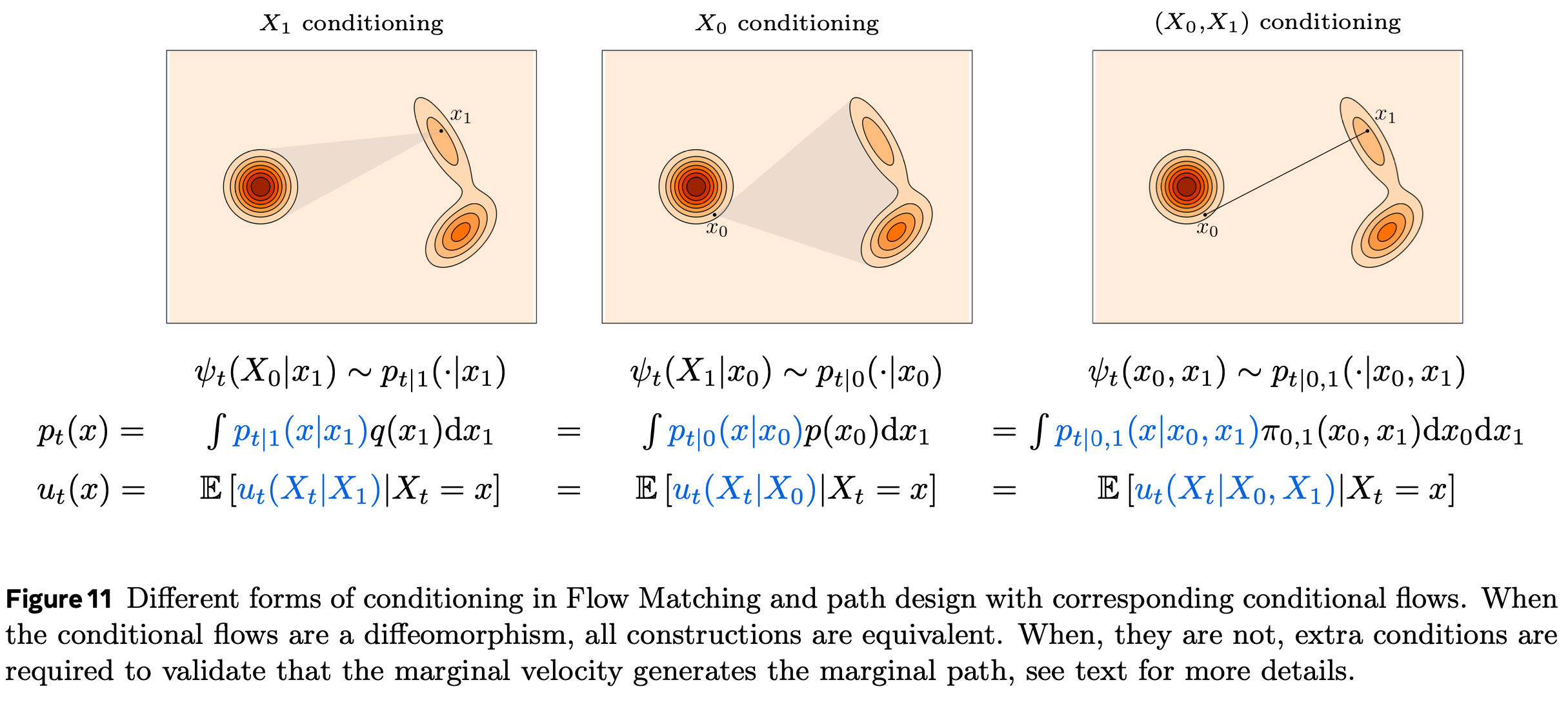 예를 들면, single target example \(X_1 = x_1\)로 conditioning 하는 경우 \(p_{t|1}(x|x_1)\) 를 얻을 수 있으며, 이를 marginalize하여 \(p_t\)를 구성할 수 있습니다.