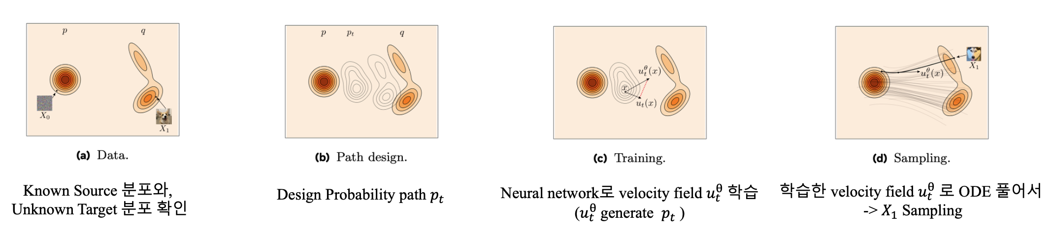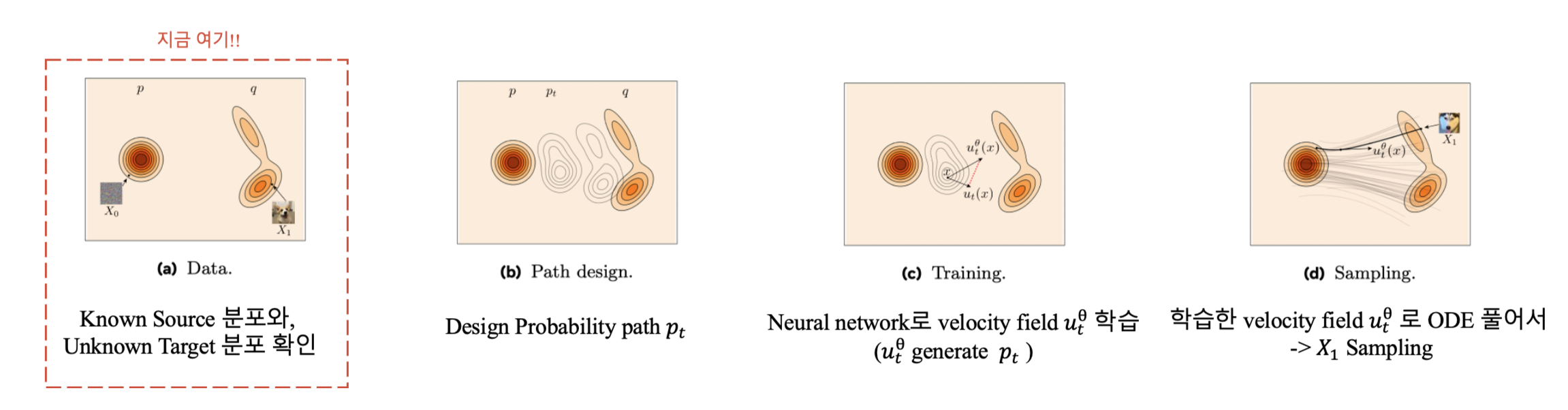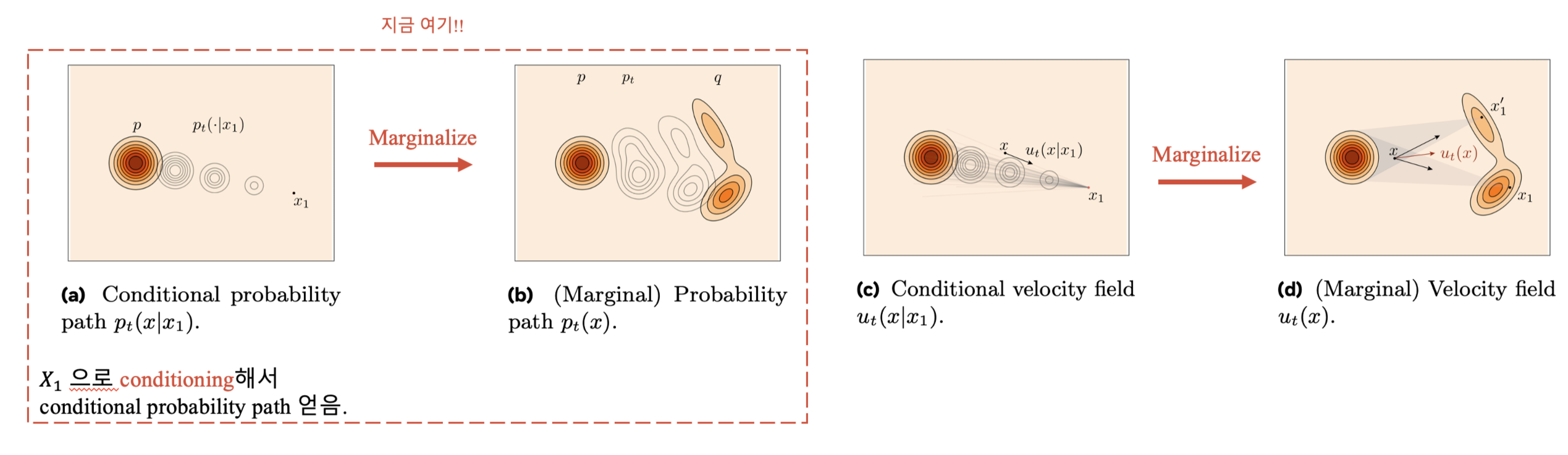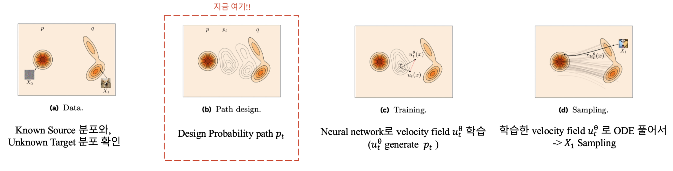 이번 section에서는 1번과 2번, 즉, conditional probability paths and velocity fields를 design 하는 방법에 대해 살펴봅니다.