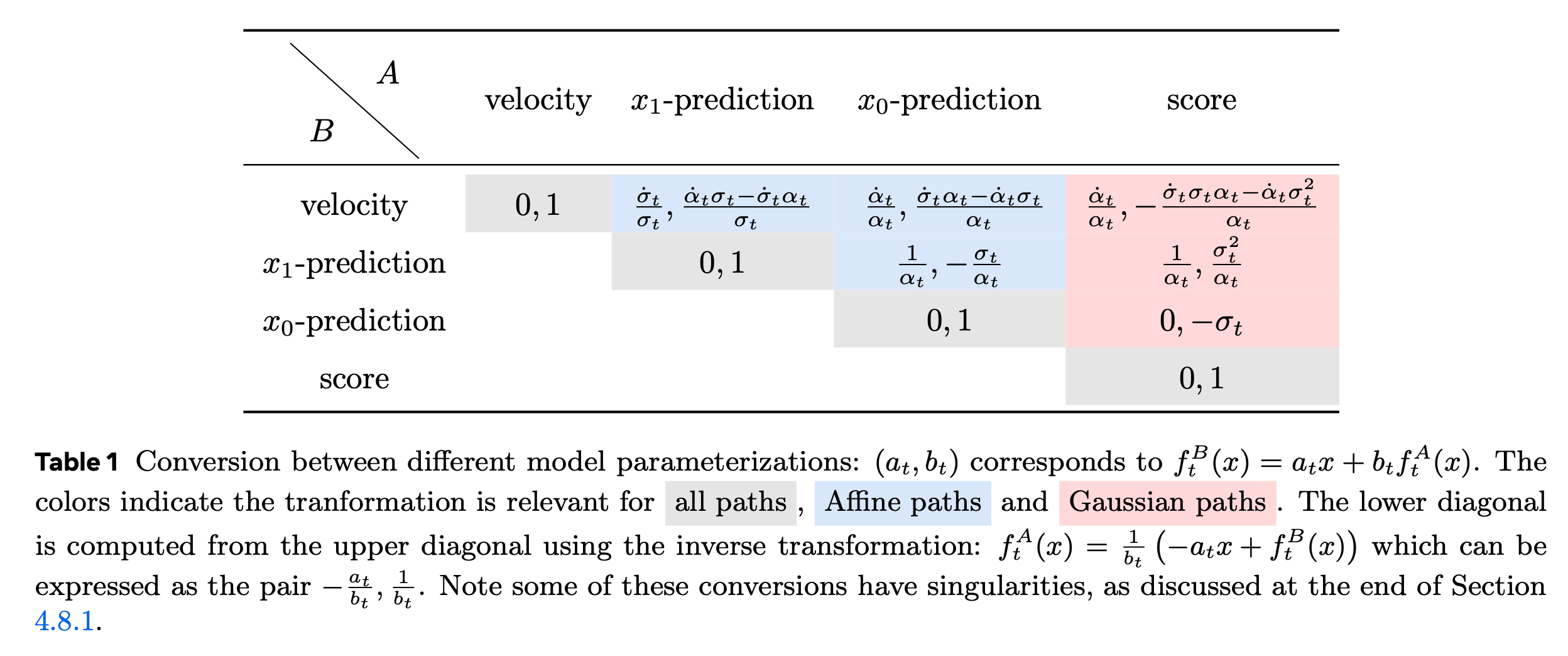 \[x_{1|t}(x) = \mathbb{E} \left[ X_1 \mid X_t = x \right] \quad \text{as the }\color{blue} x_1 \text{-prediction (target)} \color{black}\] \[x_{0|t}(x) = \mathbb{E} \left[ X_0 \mid X_t = x \right] \quad \text{as the } \color{red} x_0\text{-prediction (source)}\color{black}.\]