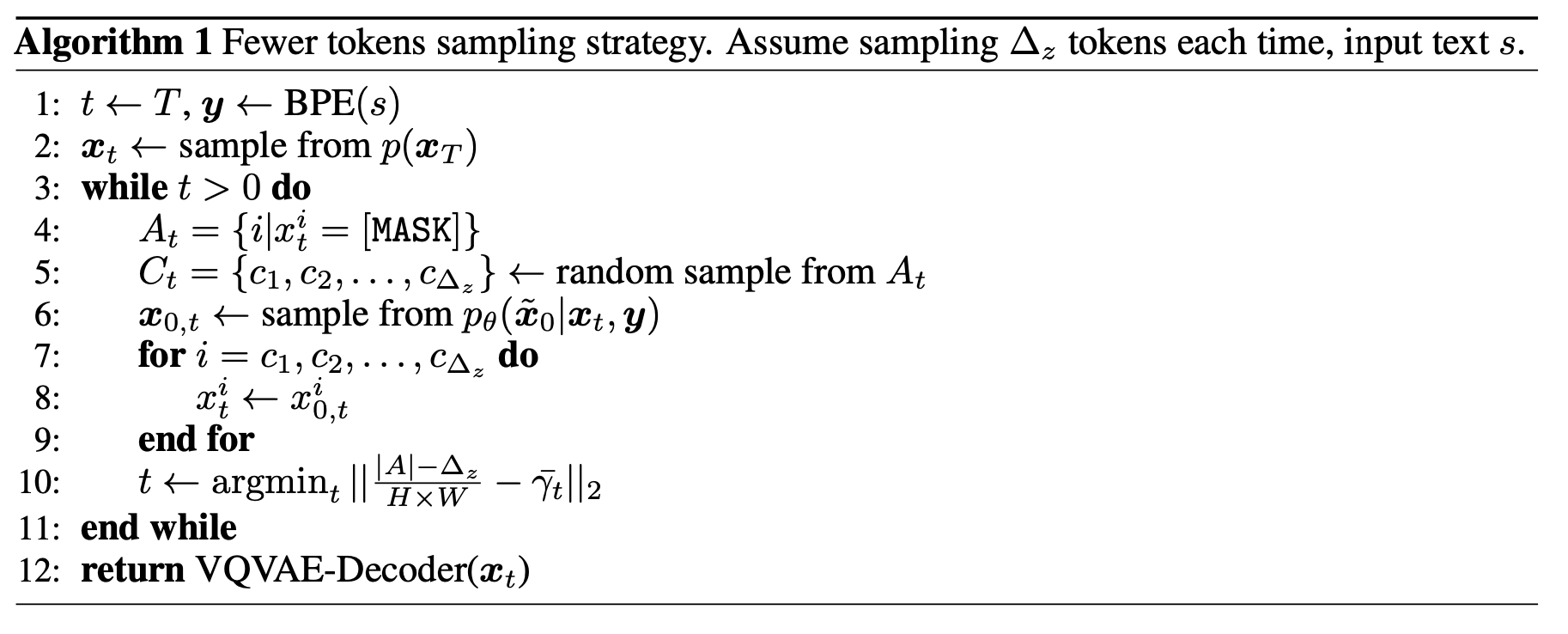 저자들의 목표는 각 step에서 \(A_t\)로부터 \(\Delta_z\)개의 [MASK] 토큰을 복구하는 것이라고 합니다. 따라서 전체 inference step은 \(T’ = (H \times W)/\Delta_z\)이며, 현재 time step은 다음과 같이 계산할 수 있다고 합니다. \(\begin{equation} \underset{t}{\arg \min} \| \frac{| A_t |}{H \times W} - \overline{\gamma}_t \|_2 \end{equation}\)
