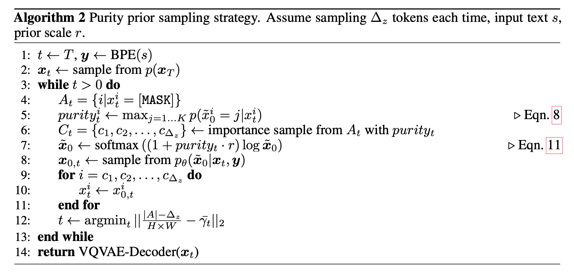 \[\begin{equation} purity(i, t) = \max_{j = 1 \cdots K} p(x_0^i = j | x_t^i) \end{equation}\]Fewer token sampling과 비슷하지만, purity 계산을 통해, sampling 위치를 결정한다는 차이가 있습니다. 또한 purity가 높은 곳에서의 확률을 sharp하게 만드는 것이 이미지 품질 향상에 도움이 되므로, softmax 함수를 사용했습니다.