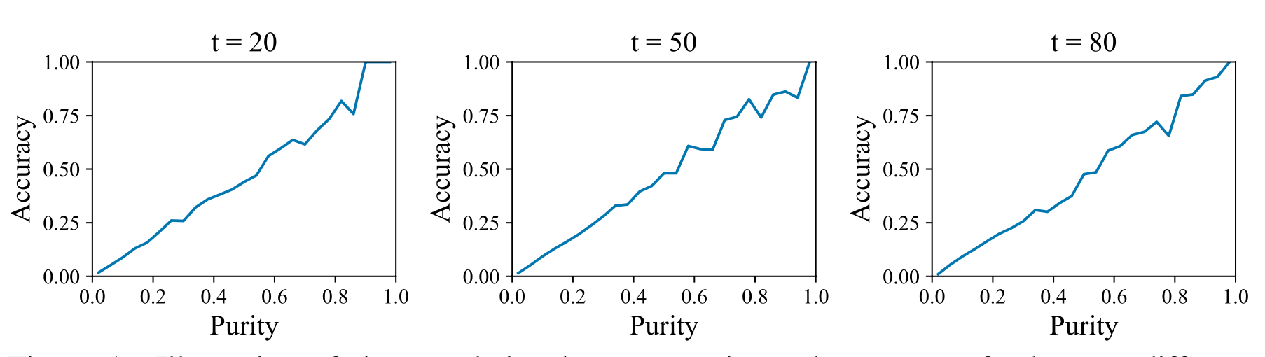 Illustration of the correlation between purity and accuracy of tokens at different timesteps(t=20, 50, and 80). We find high purity usually yields high accuracy