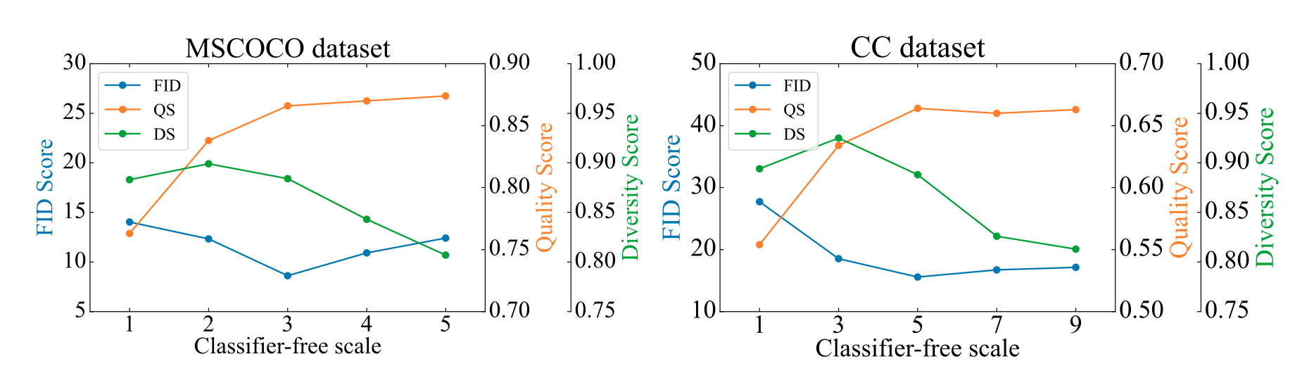 또한 저자들은 guidance scale \(s\)를 바꿔가면서도 실험을 진행한 결과, \(s\)를 키울수록 QS는 증가했지만, DS는 감소하는 경향이 있음을 확인했습니다.