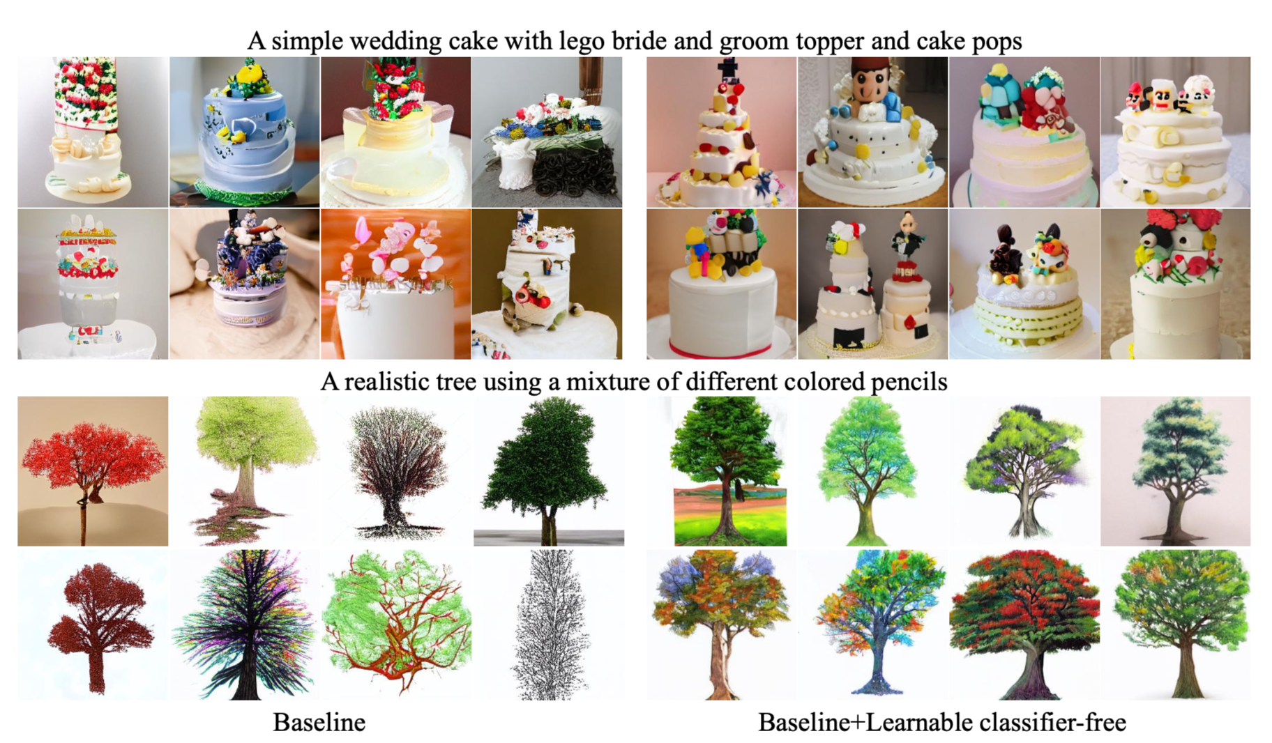 - Continuous diffusion model은 \(p(x)\)를 예측하기 위해 “null” text를 사용하지만, Discrete diffusion model은 학습 가능한 벡터를 사용합니다.