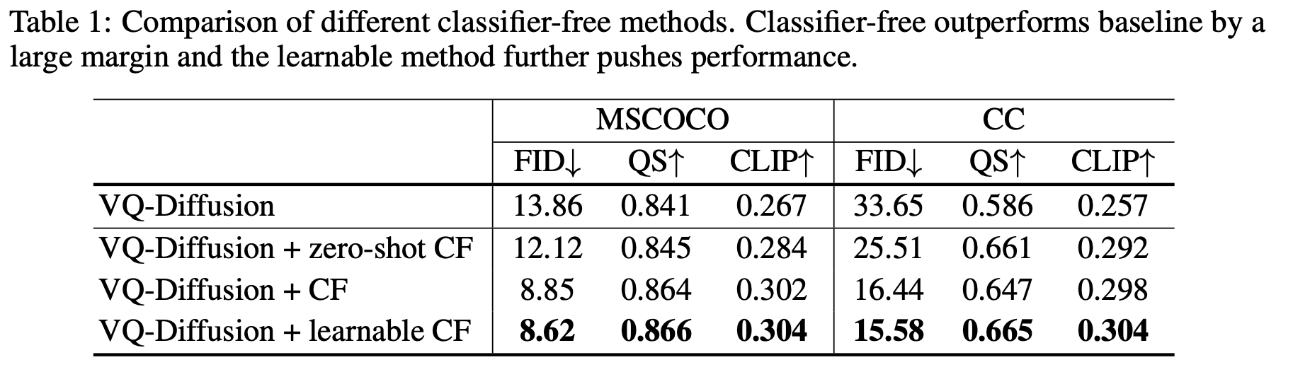 Zero-shot Classifier-Free Sampling과 고품질 추론 전략을 활용하여, 추가 훈련 없이 잘 훈련된 VQ-Diffusion 모델의 성능을 향상시켰으며, 모델을 학습 가능한 classifier-free 전략으로 fine-tuning할 경우, 성능이 더욱 개선되었다고 합니다.