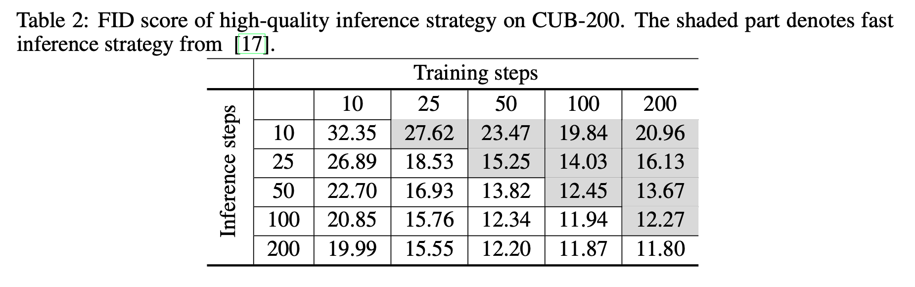 이전 연구들은 빠른 이미지 생성을 위해 학습에 사용한 것보다 적은 inference step을 이용해 이미지를 생성하는 방법론을 제시합니다. 하지만 저자들은 inference step을 늘려 이미지 품질을 향상 시키는 방법을 확인했다고 합니다. CUB-200 데이터셋에서 실험 수행하여, 25, 50, 100, 200 inference step에서 훈련된 모델의 성능 평가한 결과 inference step이 늘어날수록 더 좋은 FID score를 얻을 수 있었다고 합니다.