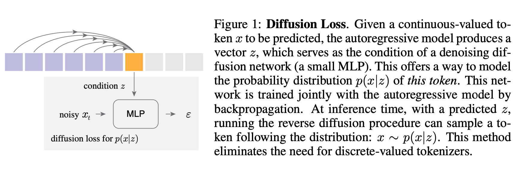 즉 저자들은 continuous-valued vector \(x \in \mathbb{R}^d\)를 다음 위치에서 예측할 ground-truth token이라 할 때, AR 모델로 \(z \in \mathbb{R}^D\) 를 만들고, 이를 diffusion loss를 이용해 \(p(x|z)\)를 모델링 하고 싶은 것!