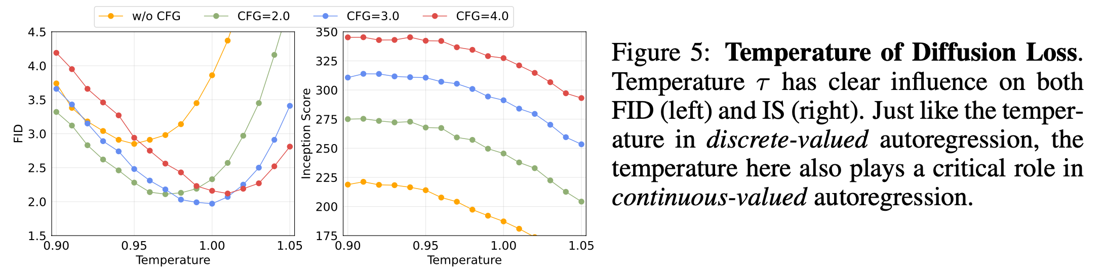 MAR은 개념적으로 MAGE (혹은 MaskGIT)과 관련이 있다고 합니다. 하지만, MAR은 각 token의 probability distribution에 대해 \(\tau\)를 적용했지만, MAGE (혹은 MaskGIT)는 token location을 sampling할 때 \(\tau\)를 적용했다는 차이가 있다고 합니다. (결과적으로 완전히 randomized 하지 않으며, training-time and inference-time behavior의 커다란 차이를 야기함)