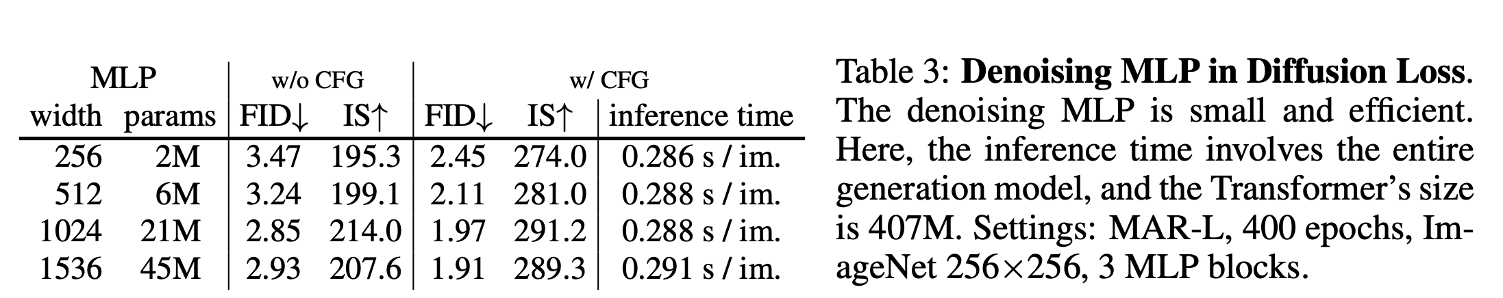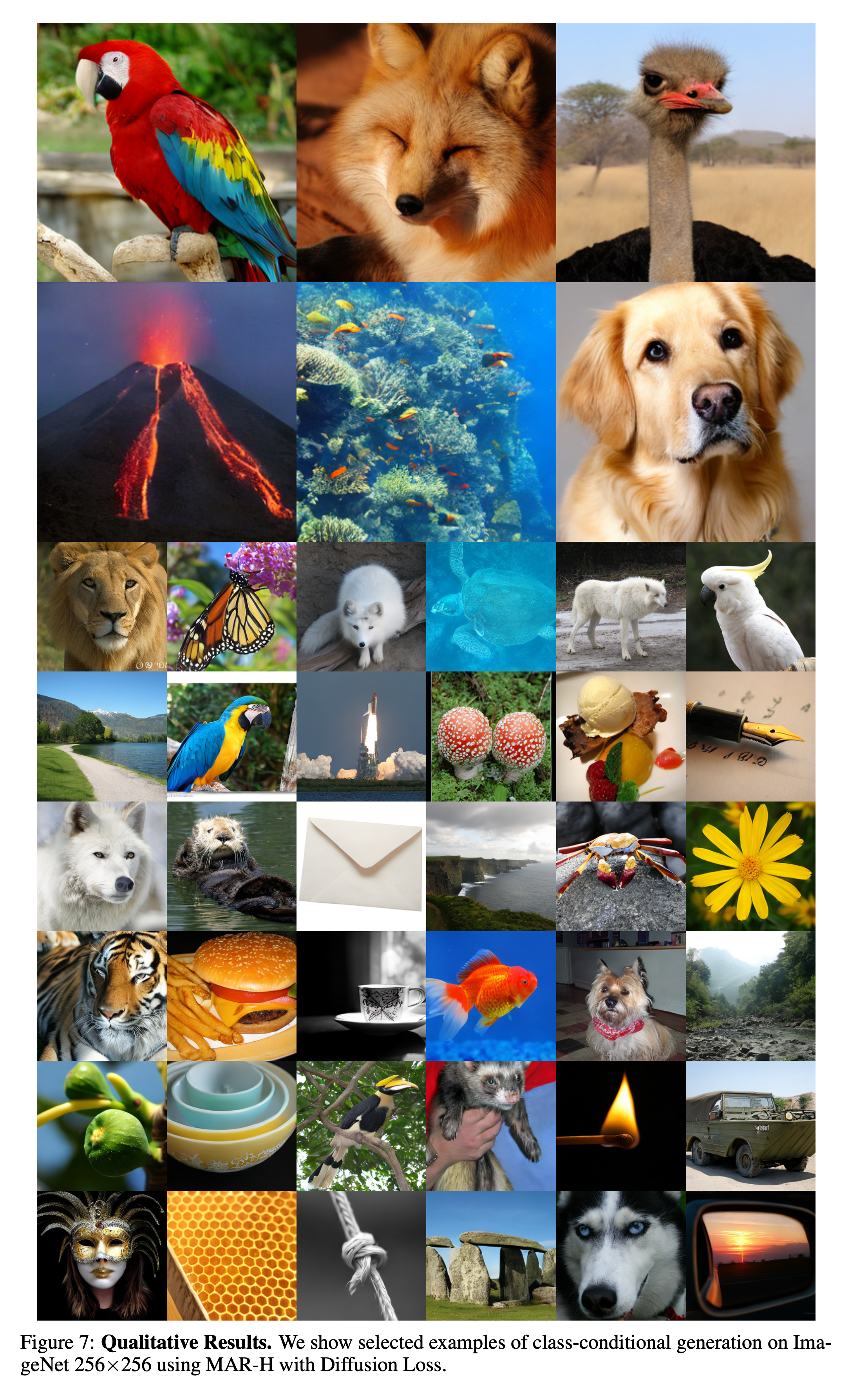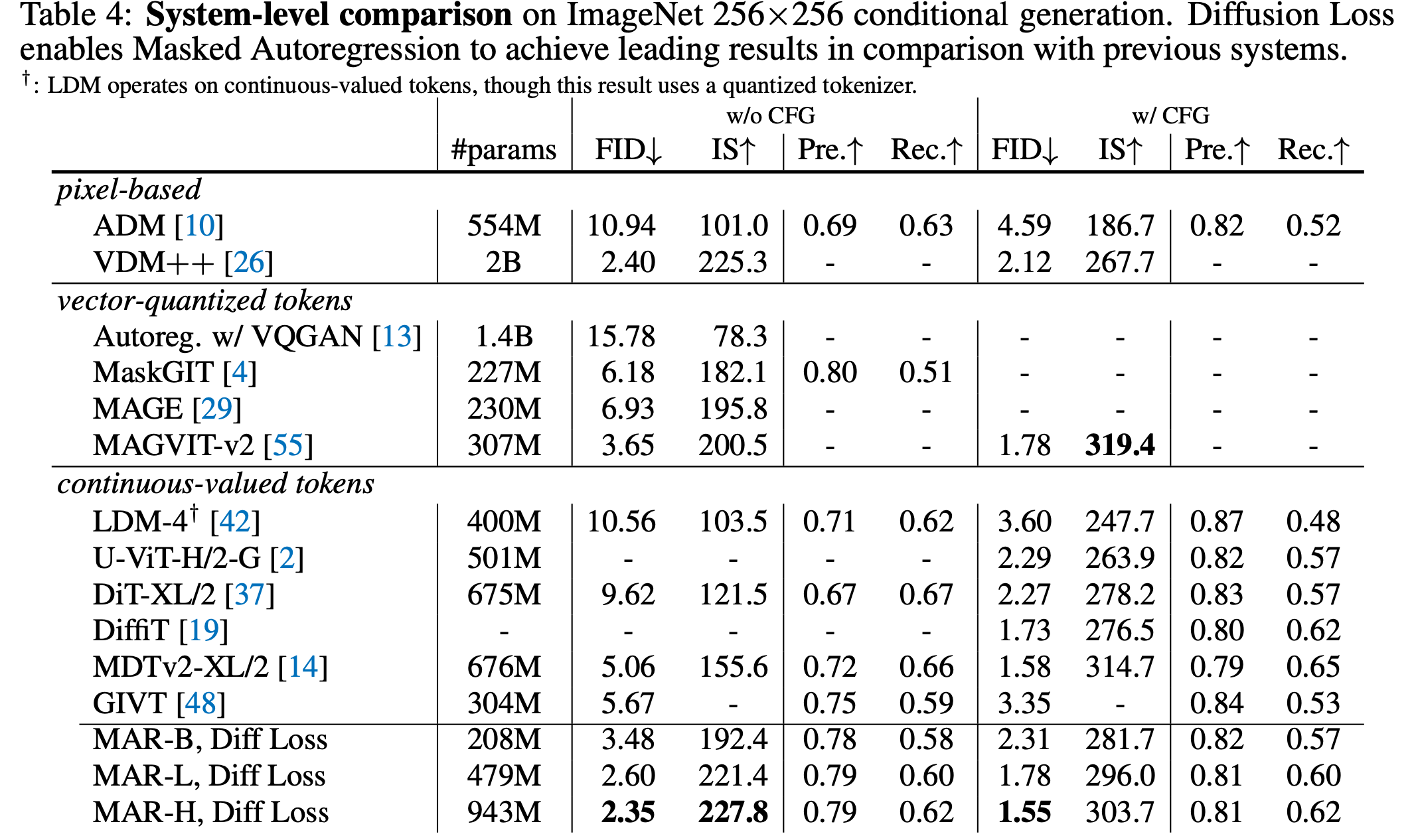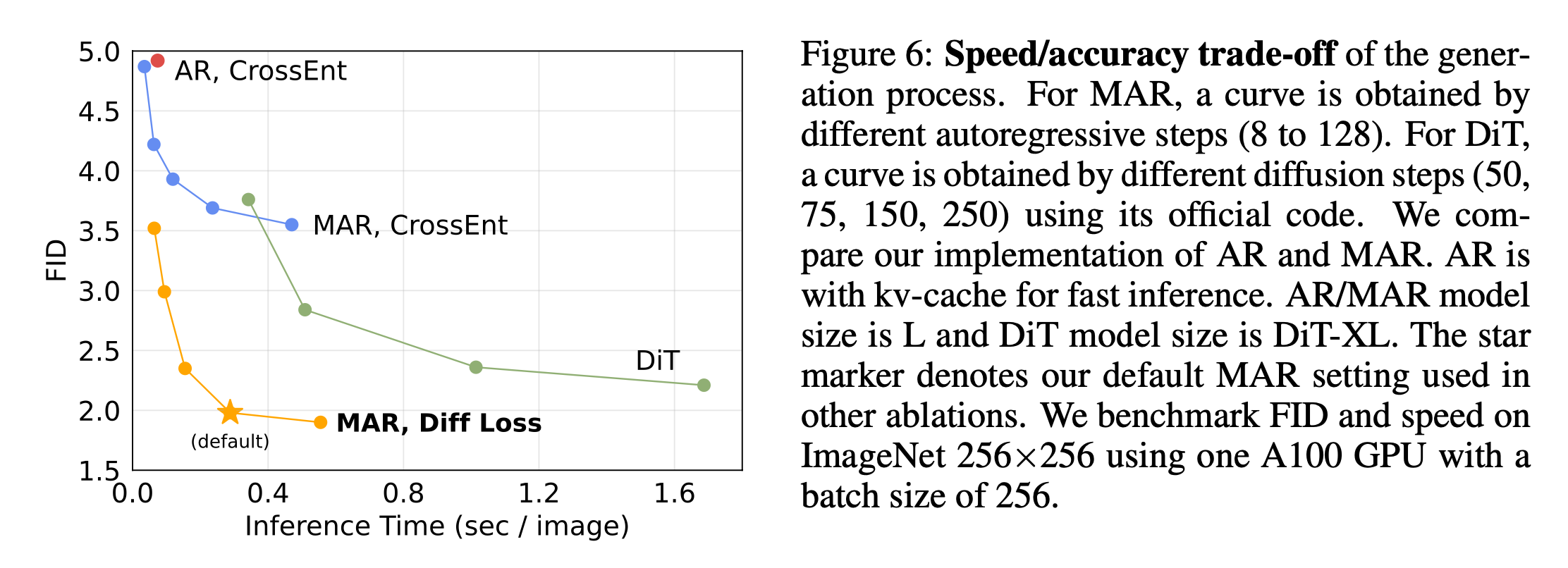 또한 MAR은 최근 주목받는 Diffusion Transformer(DiT)와 비교해도 우수한 성능을 보인다고 합니다. DiT는 전체 Transformer 아키텍처를 사용하지만, MAR은 작은 MLP를 기반으로 작동합니다. 결과적으로, MAR은 더 빠르고 정확하며, FID < 2.0으로 < 0.3 second per image 생성 속도를 달성할 수 있었다고 합니다.