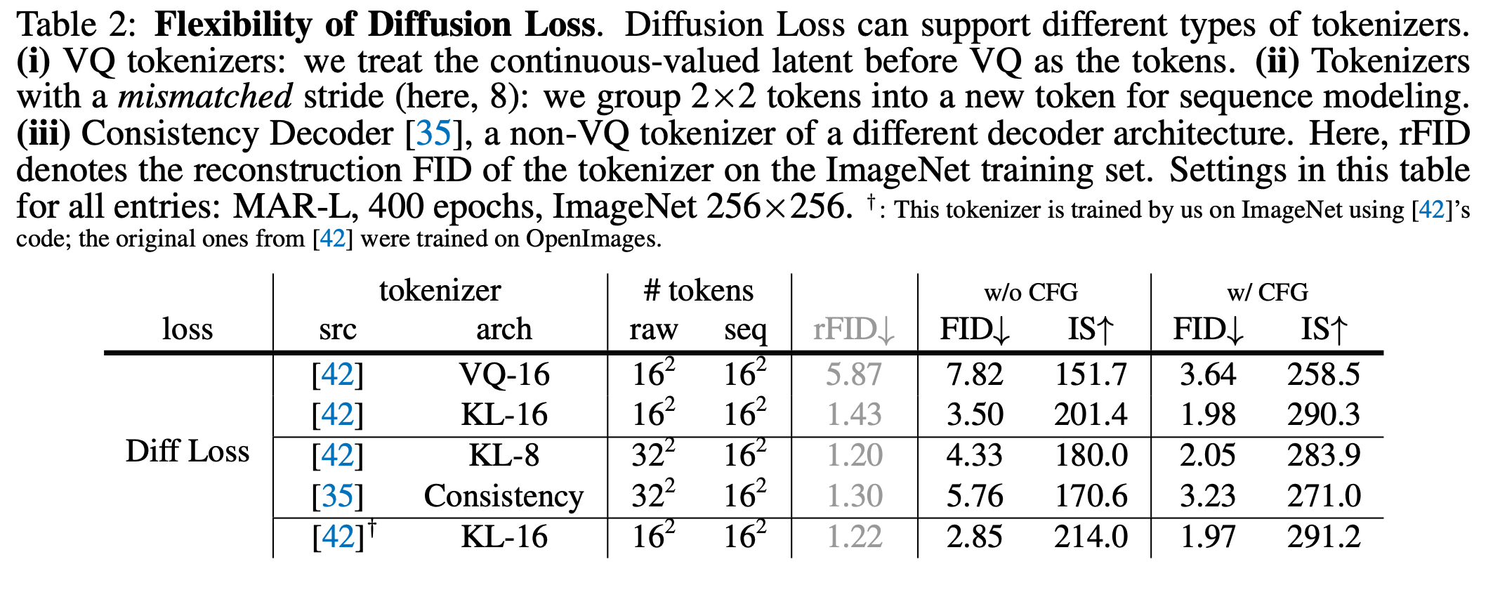 Diffusion loss의 장점으로는 다양한 토크나이저와 호환이 가능하다는 점입니다. 동일한 VQ tokenizer cross entropy 사용 시 FID 8.79, Diffusion Loss 사용 시 FID 7.82 로 성능 개선.