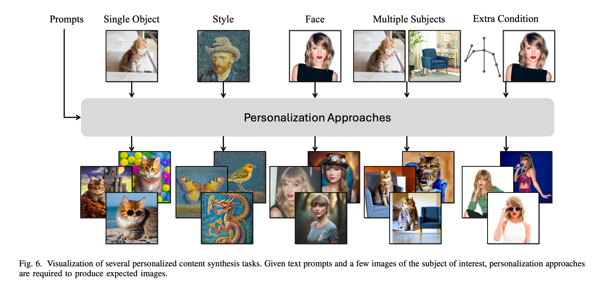 Personalization on Extra Conditions는 기본적인 이미지 생성 외에 추가적인 조건을 포함하여 콘텐츠를 개인화 하는 작업을 의미합니다. 가장 인기 있는 과제 중 하나는 추가적인 source image를 기반으로 개인화를 적용하는 것으로, 소스 이미지의 주제를 사용자 지정 객체(SoI)로 대체하는 방식입니다. 이는 개인화와 이미지 편집의 Cross domain 작업으로 볼 수 있습니다.