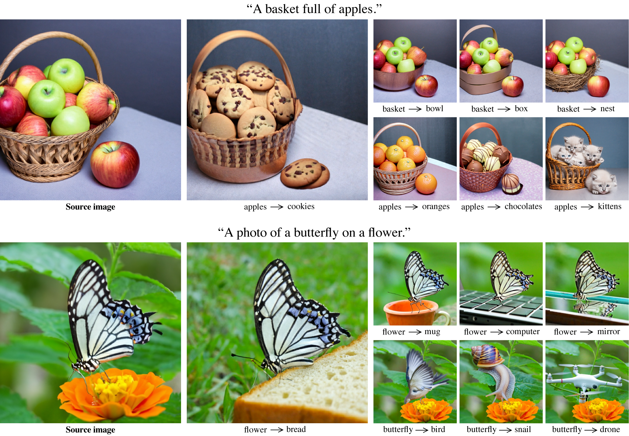 Word swap은 특정 단어를 다른 단어로 바꾸어 이미지를 수정하는 방법입니다. 이 task의 main challenge는 original 부분을 보존하면서 특정 content만 바꾸는 것입니다.
