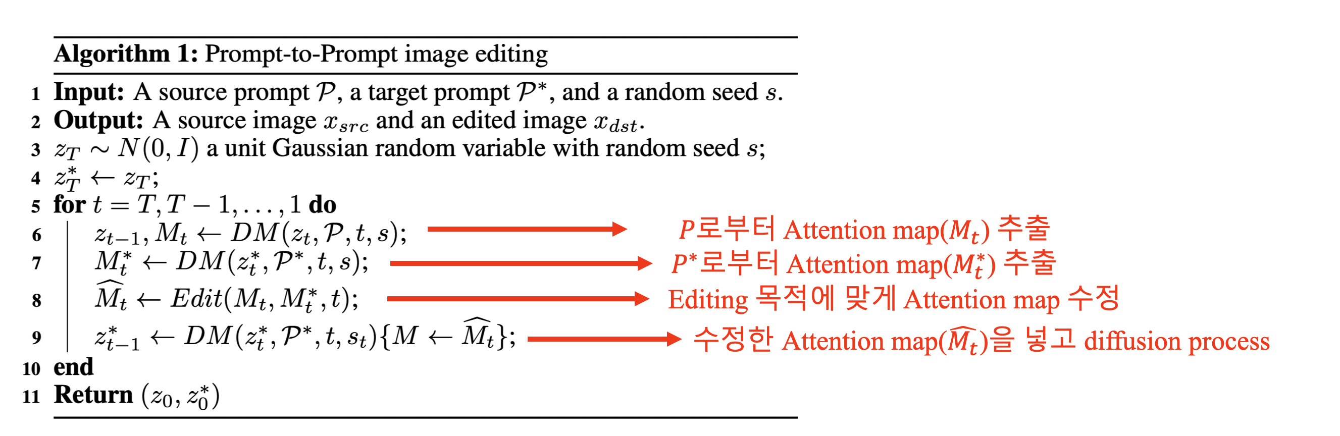 \(DM(z_t, \mathcal P, t, s)\)를 \(t\) step에서의 diffusion process라 하면, output은 noisy image \(z_{t-1}\), attention map \(M_t\)입니다.