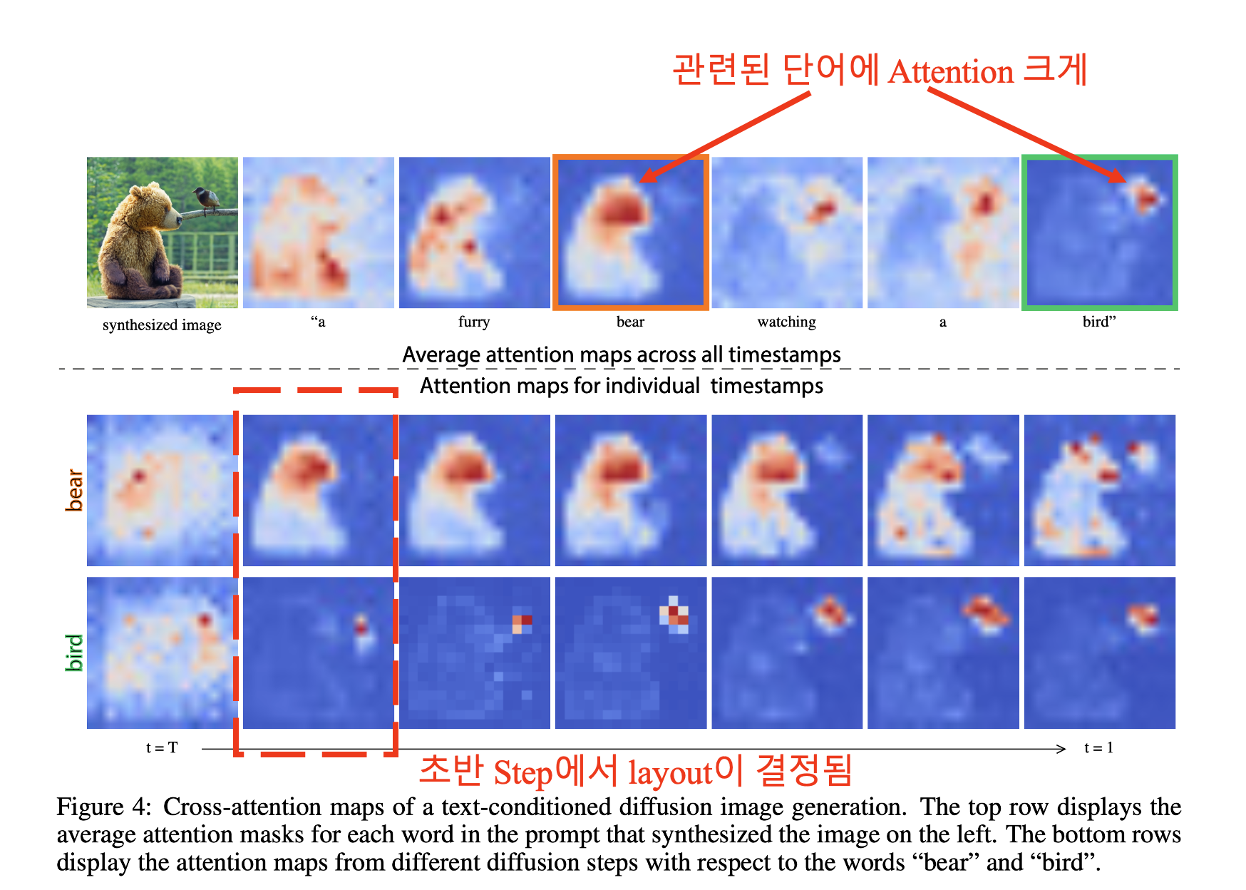 위에서 볼 수 있듯이, Spatial layout, geometry는 cross-attention map에 의존합니다. (특히 그 단어와 관련된 부분에 더 attend 하는 것을 볼 수 있습니다) 특히나 아래 그림에서 볼 수 있듯이 diffusion step의 초기부터 전체적인 image structure이 정해집니다.