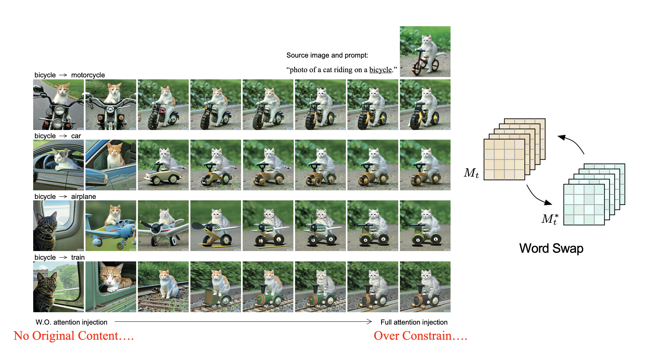 Text-to-Image 모델에서 Cross-attention layer를 활용해 원래 Object의 특징을 유지하면서 text-prompt로 이미지를 유연하게 editing하는 방법론을 제안합니다.
