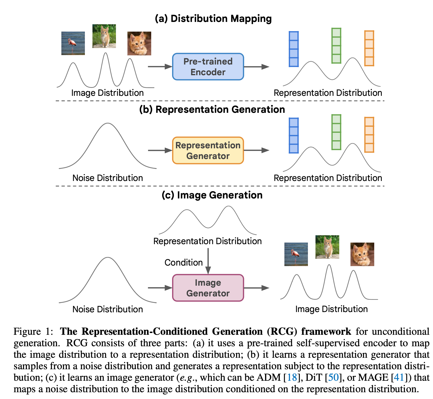 Self-supervised Encoder를 이용해 representation을 modeling하고, 이를 condition으로 이용하는 Image generator를 사용하는 RCG 제안.
