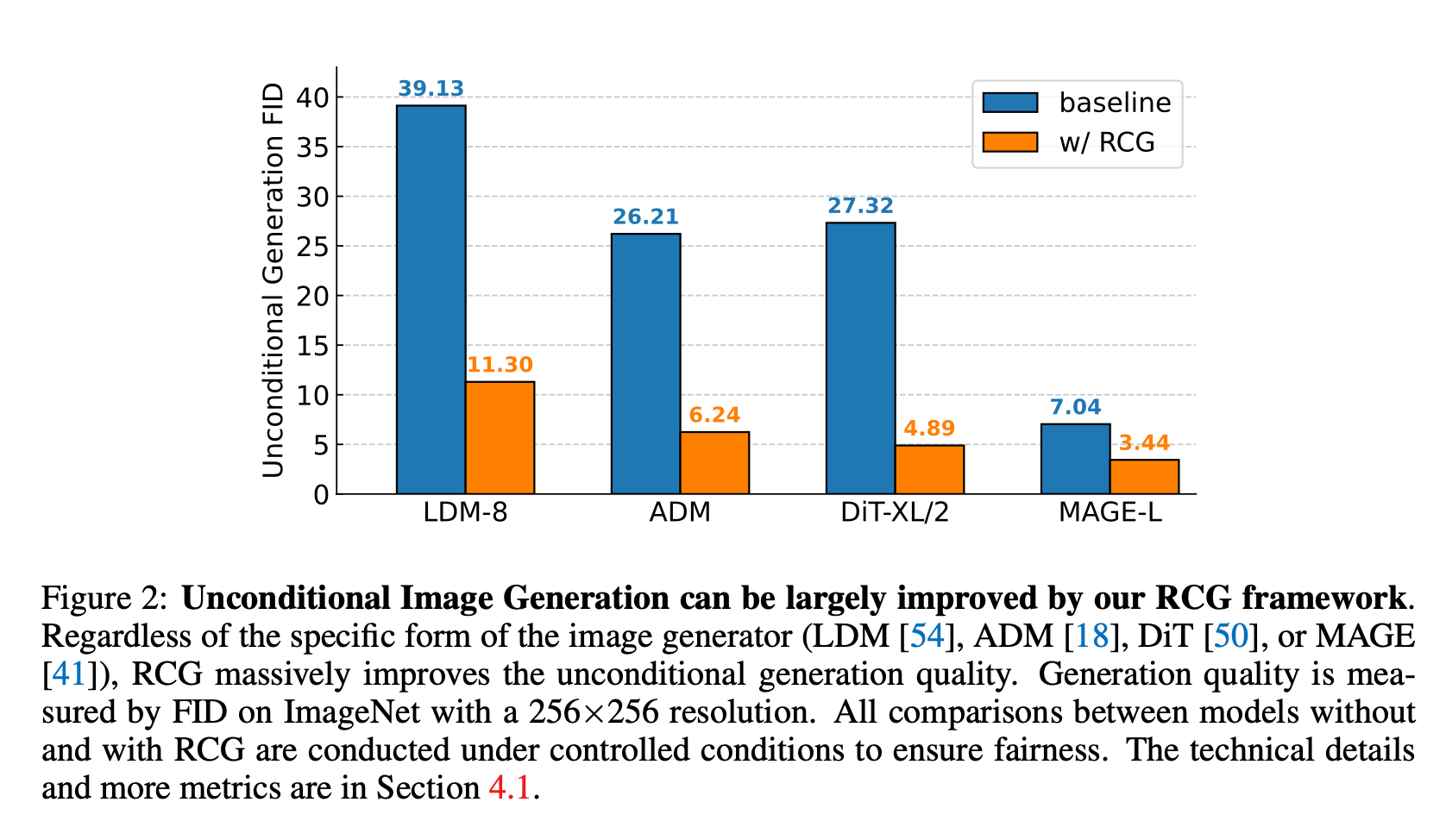 RCG는 개념적으로 간단하고 유연하며, 조건 없는 생성에서 매우 효과적이라고 합니다. 실제로 위 그림에서 볼 수 있듯이, RCG는 image generator에 관계없이 unconditional 생성 품질을 크게 향상시킵니다. 이는 현재의 생성 모델이 수동 라벨에 의존하는 정도를 크게 줄인다는 것을 의미합니다.