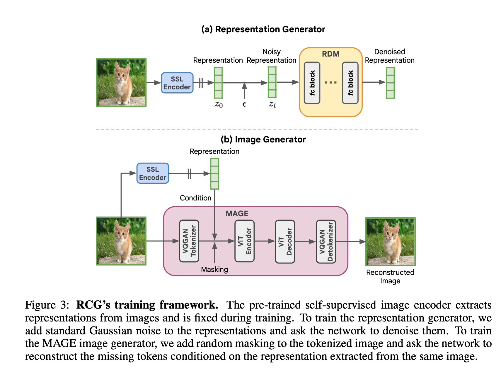 앞에서 말한 것처럼 RCG는 3개의 파트로 구성되어 있습니다. 1) Distribution Mapping (Pre-trained SSL Encoder), 2) Representation Generator, 3) Image Generator