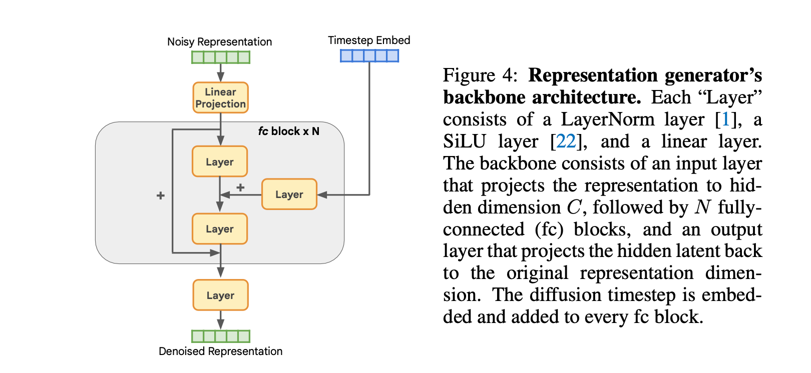 위에서 얻은 representaion을 학습하고, 생성하는 Representation Diffusion Model (RDM)을 제안합니다. 구조는 FC layer와 residual로 구성된 간단하고, 가벼운 네트워크 입니다.