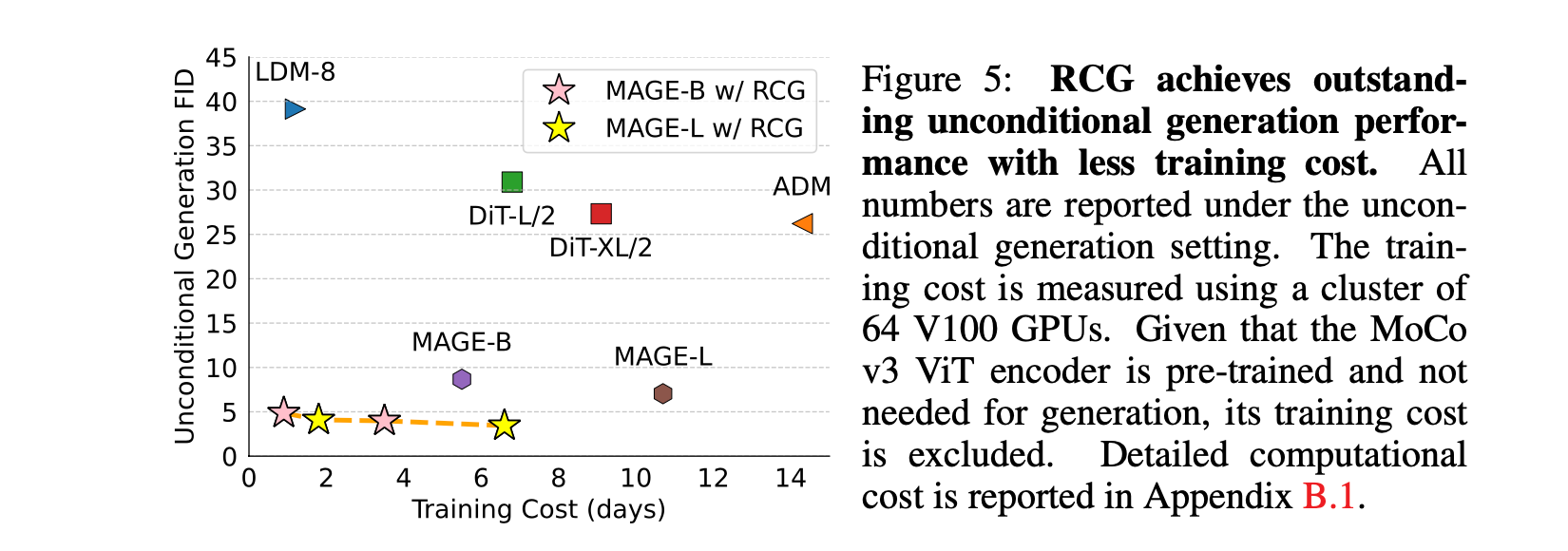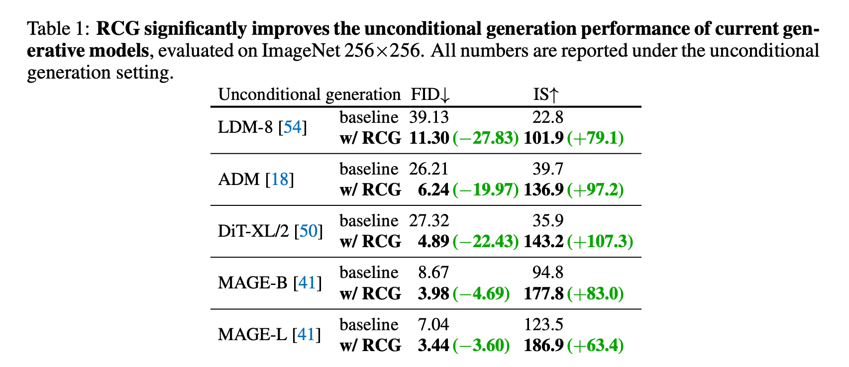 RCG는 unconditional image generation에서 SOTA를 크게 개선했습니다.