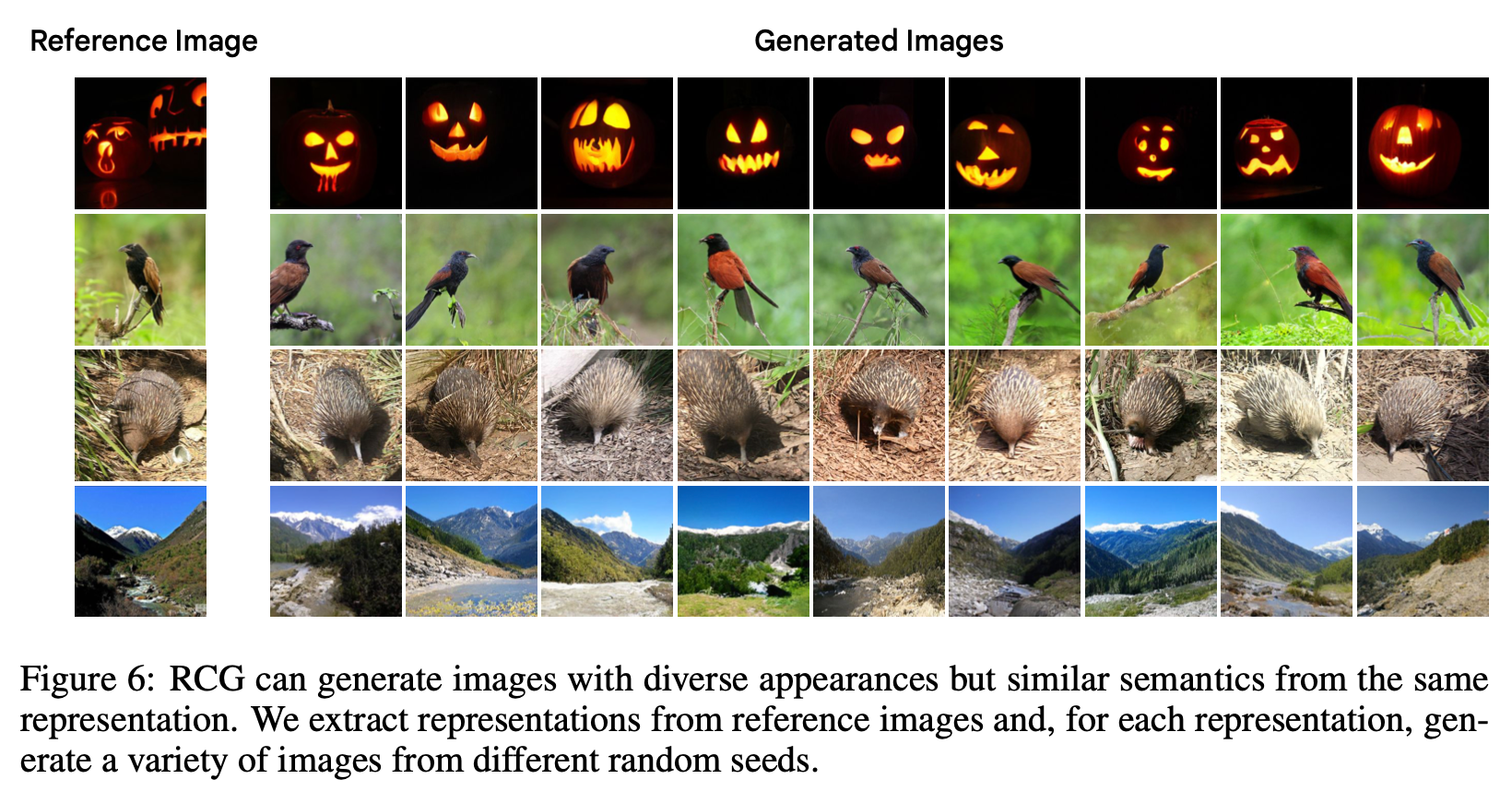 RCG가 동일한 참조 이미지에서 추출된 표현을 기반으로 다양한 세부사항을 가진 이미지를 생성할 수 있음을 보여줍니다.