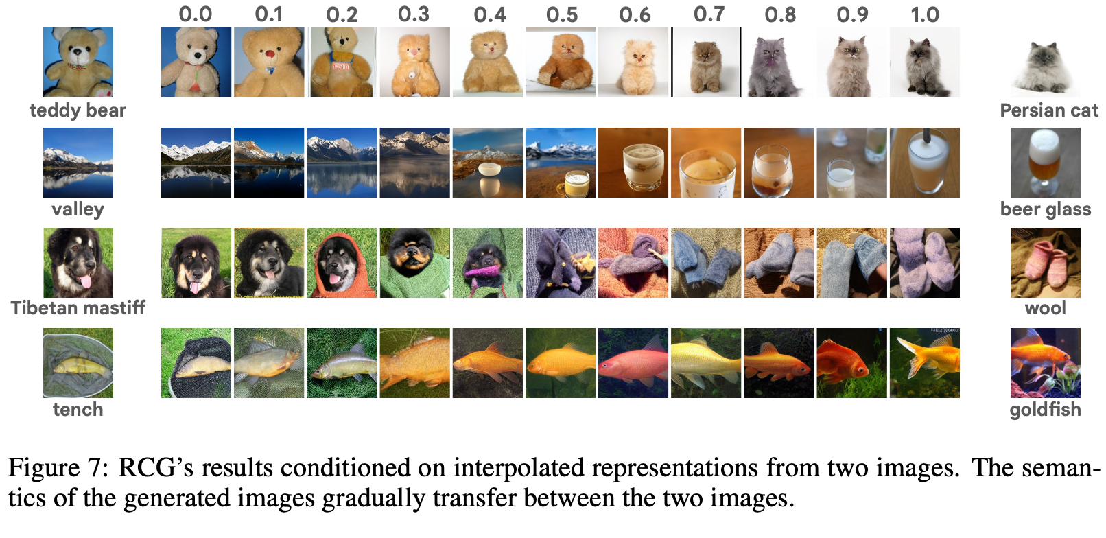 생성된 이미지의 의미가 점진적으로 두 이미지 사이를 전환하며, RCG의 representation interpolation 능력을 강조합니다.