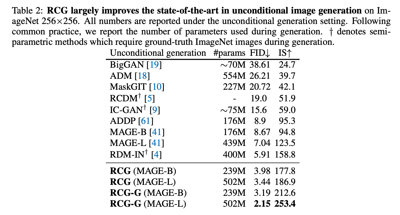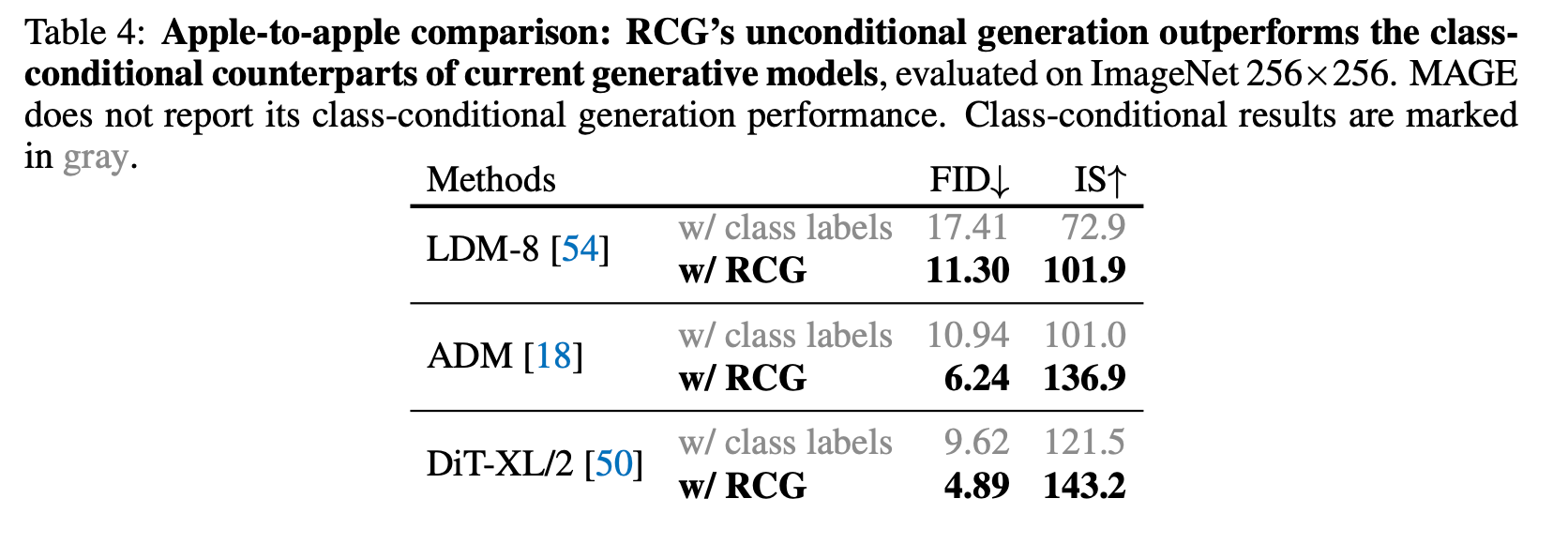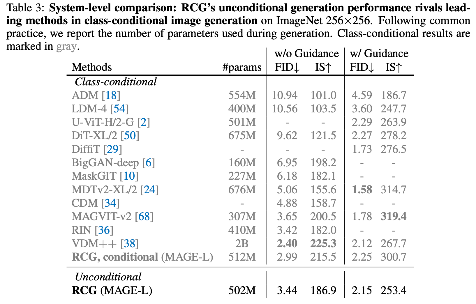 RCG’s unconditional generation performance rivals leading methods in class-conditional image generation