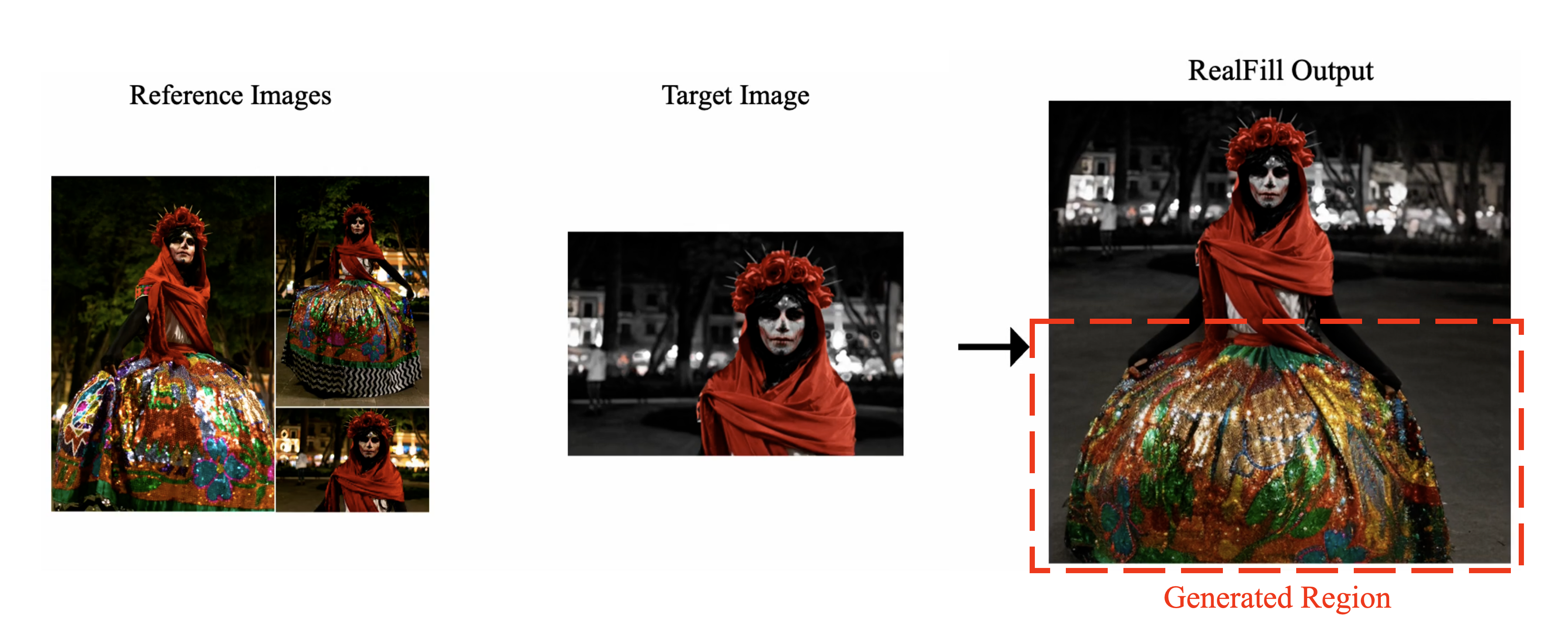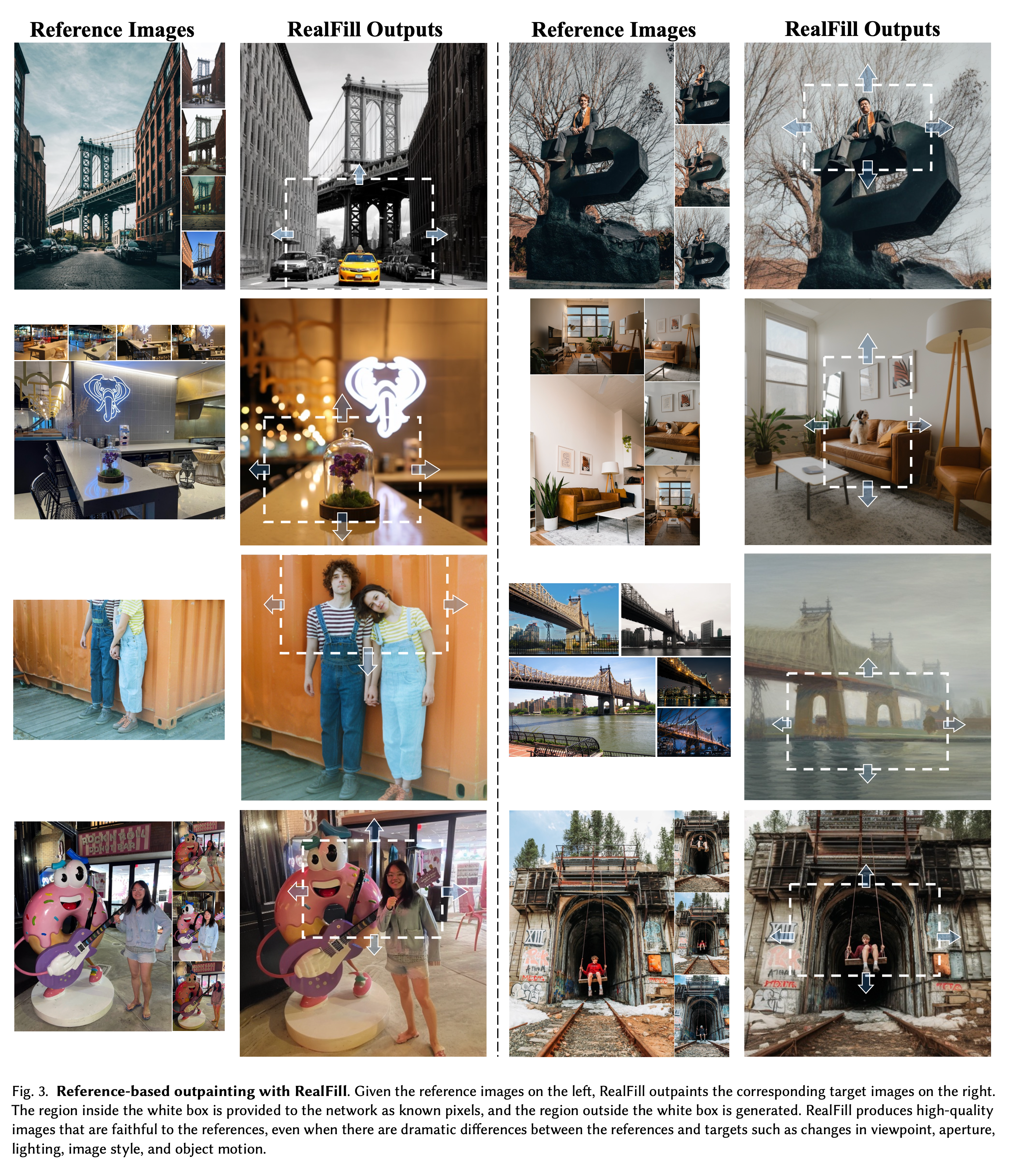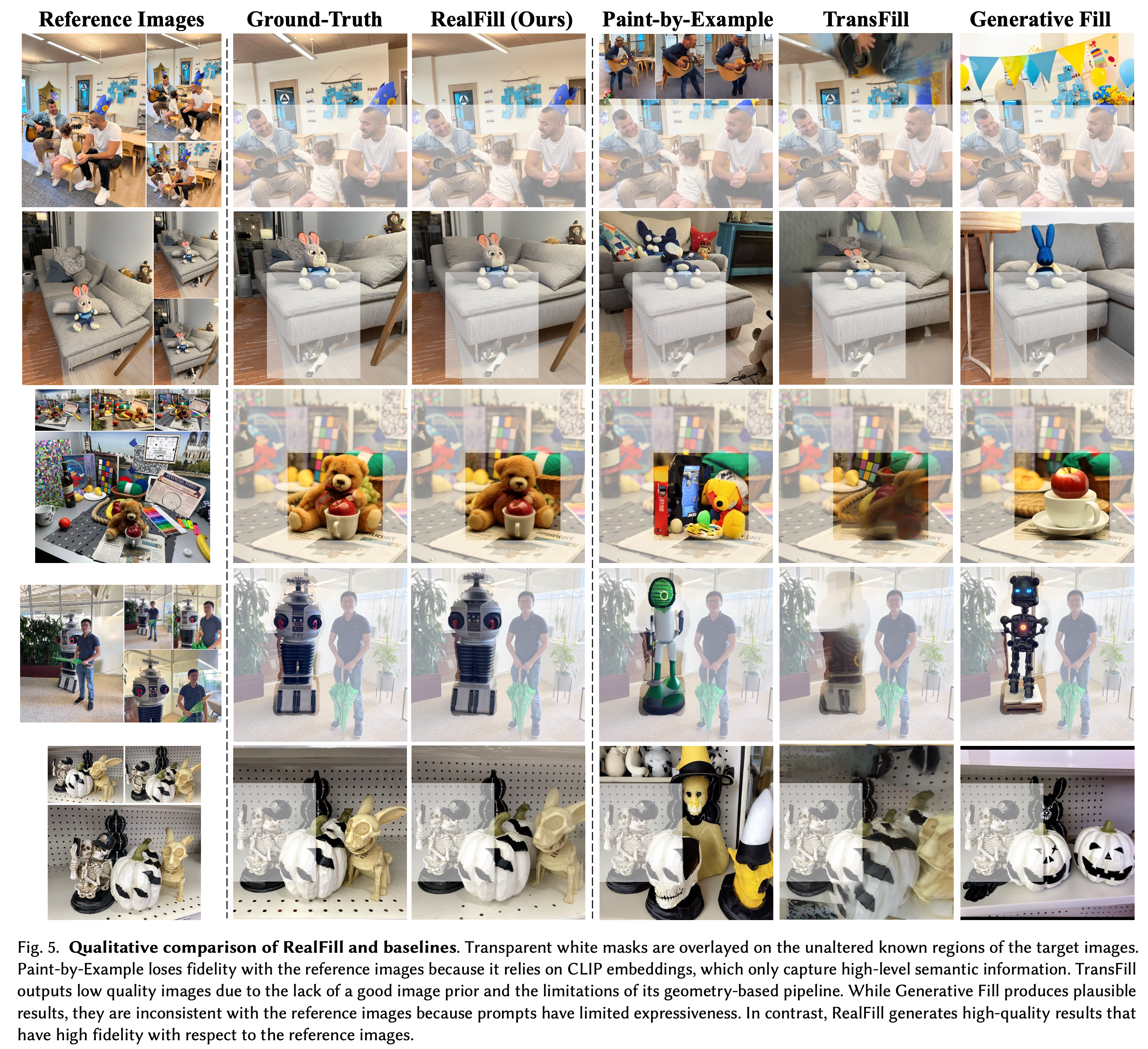 이에 비해 RealFill은 여러 참조 이미지를 사용해 다양한 차이점(뷰포인트, 조명, 스타일)을 극복하며, 더 자연스럽고 사실적인 이미지를 생성합니다 .