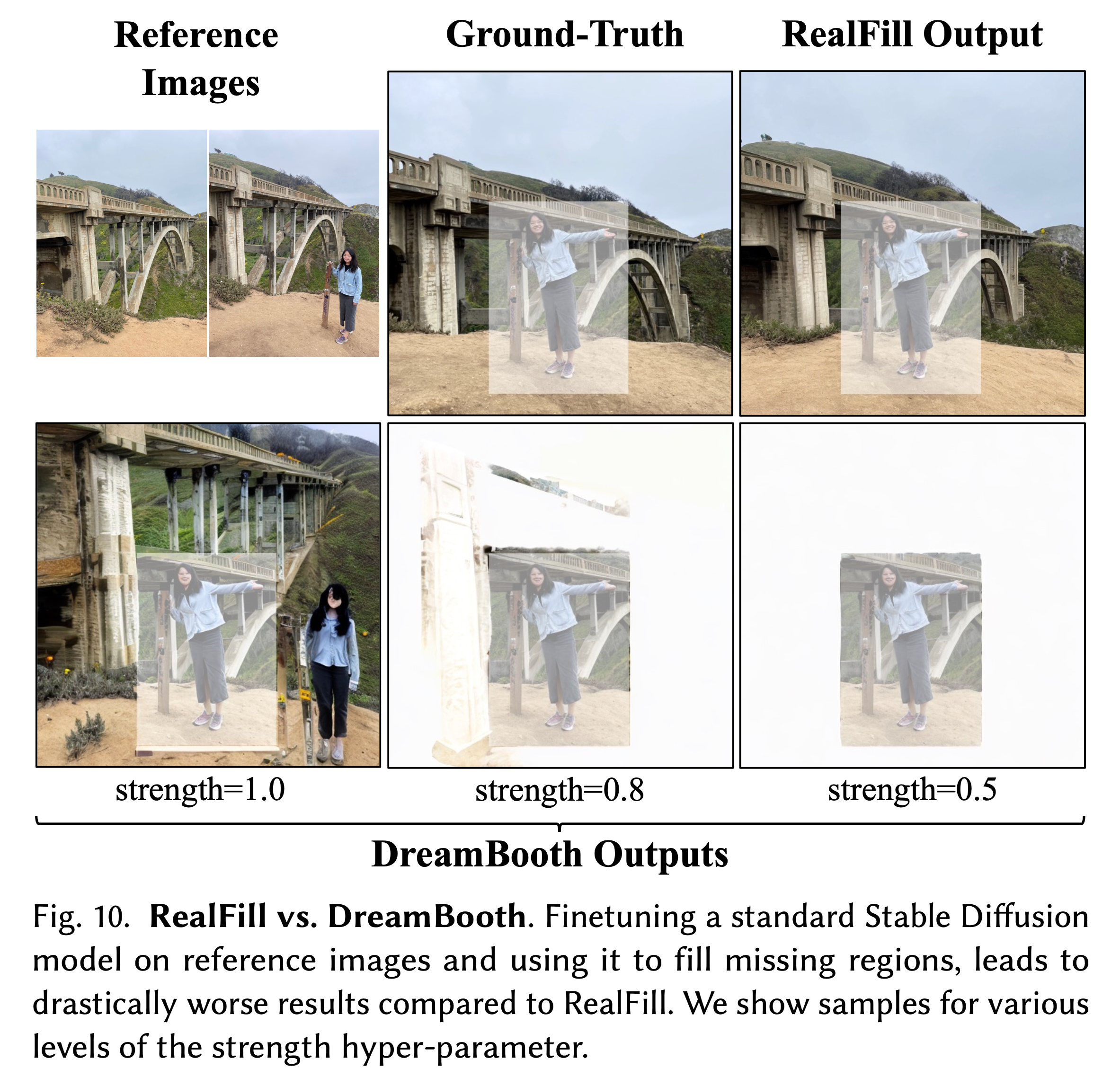 - DreamBooth: RealFill 대신 DreamBooth 방식으로 Stable Diffusion 모델을 참조 이미지로 미세 조정하여 사용할 수 있지만, 이 방법은 마스킹 예측 목표로 훈련되지 않기 때문에 RealFill에 비해 성능이 훨씬 떨어진다고 합니다.