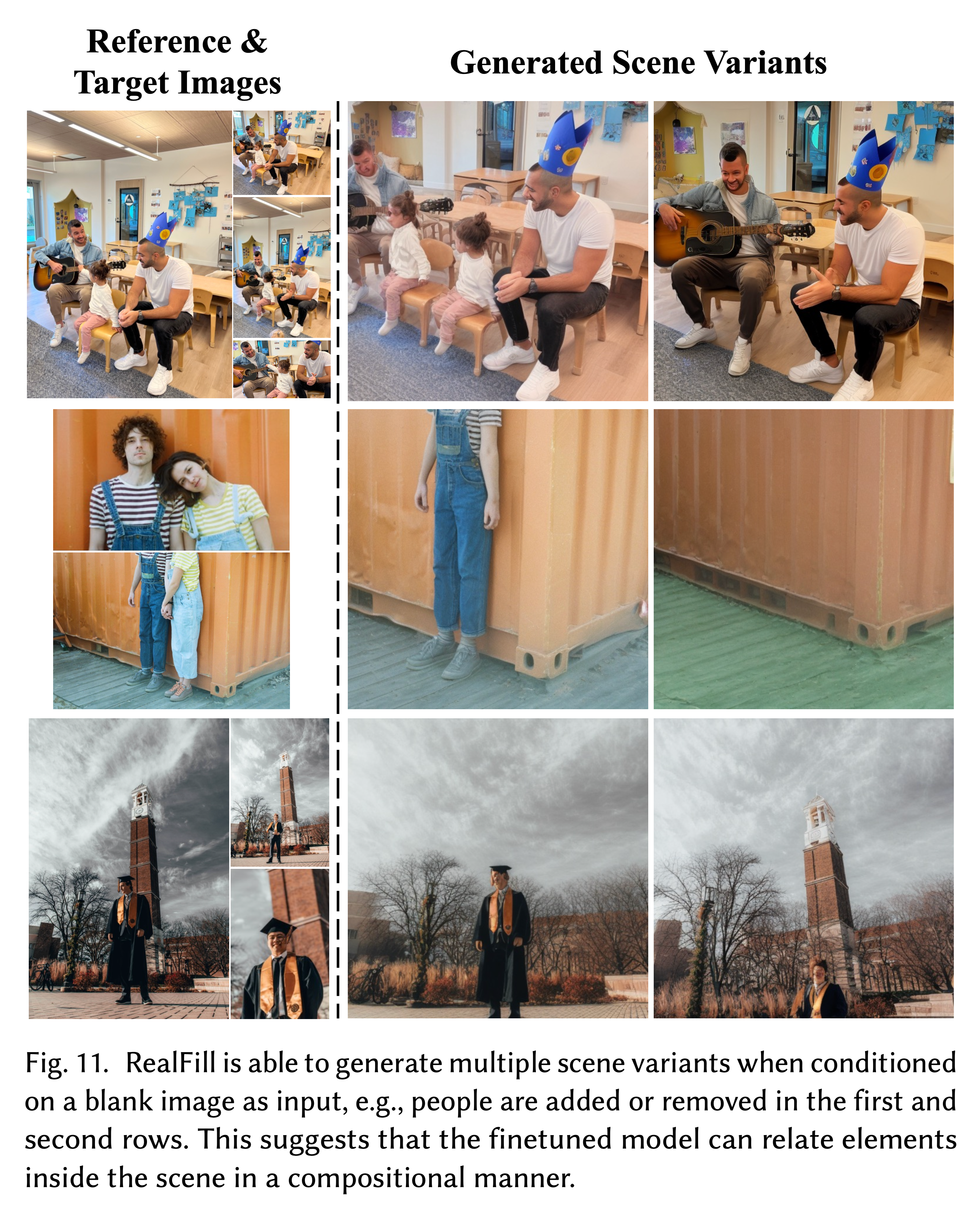 Scene Composition 이해: Inference 시 조건 이미지(목표 이미지)를 빈 캔버스로 설정하여 실험해 본 결과, 모델은 장면의 다양한 구조 변형을 생성할 수 있었습니다(예: 전경 또는 배경 물체 제거, 물체 레이아웃 조정 등). 이는 RealFill이 장면 구성에 대한 이해를 갖추었음을 시사합니다.