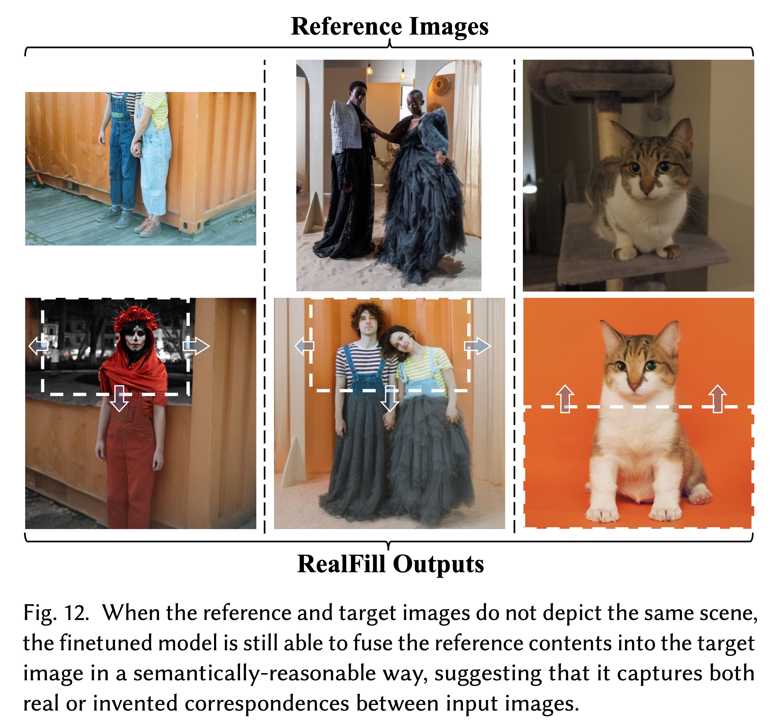 Input Images 간의 Correspondence 캡처: 참조 이미지와 목표 이미지가 동일한 장면을 묘사하지 않더라도, 모델은 참조 이미지의 관련 내용을 목표 영역에 자연스럽게 융합해 복원을 수행합니다. Figure 12는 RealFill이 참조 이미지와 목표 이미지 간의 실제 또는 가상의 대응 관계를 캡처하여 활용할 수 있음을 보여줍니다. 이는 사전 학습된 diffusion 모델 내에서 emergent correspondence를 발견한 이전 연구들과도 유사합니다.
