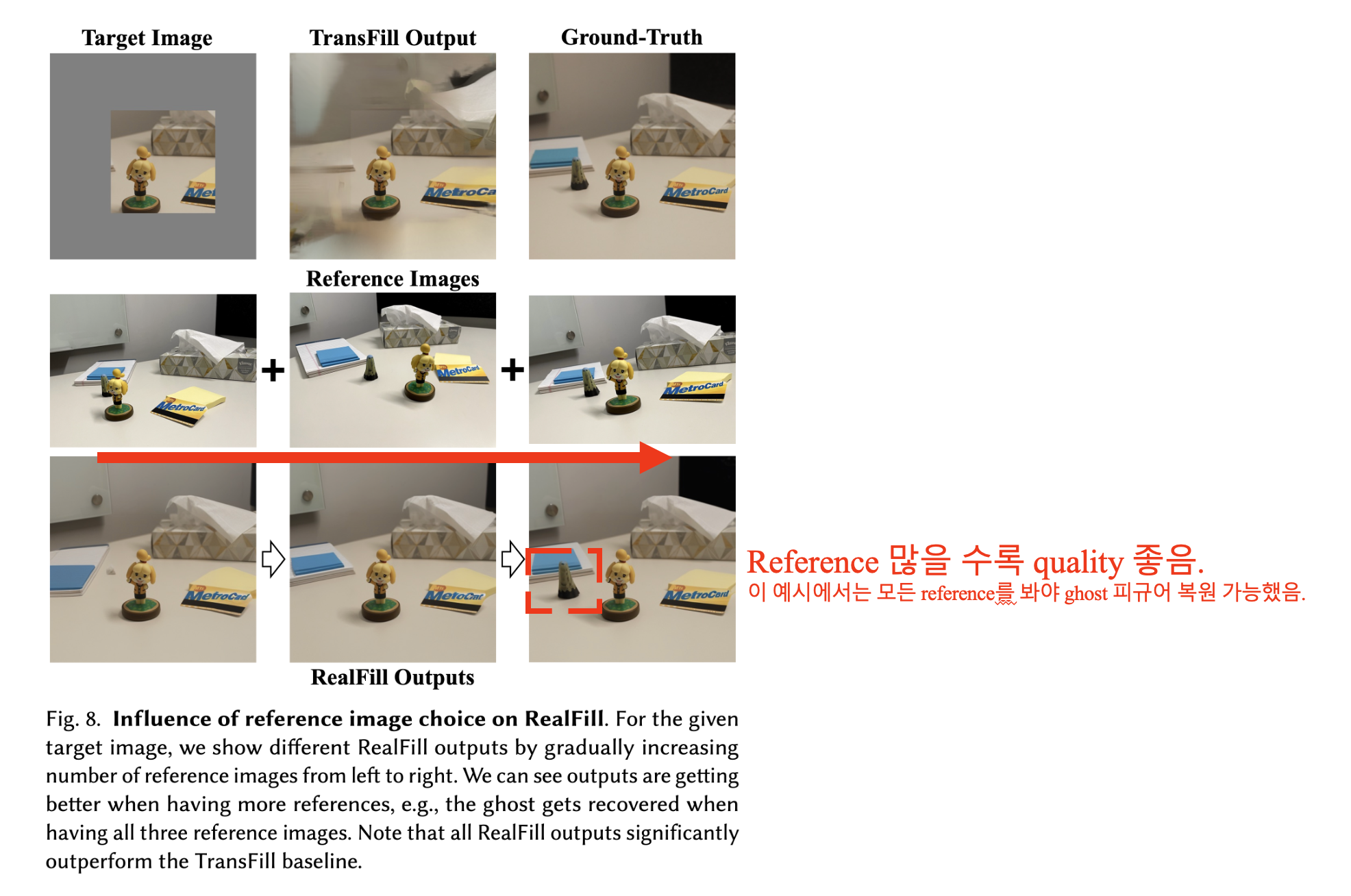 저자들은 이 과정에서 Correspondence-Based Seed Selection을 도입하여, 참조 이미지와 일치하지 않는 저품질의 샘플을 자동으로 제거합니다. 이를 통해 사용자의 개입을 줄이고, 최종 출력물의 품질을 보장할 수 있었다고 합니다. RealFill의 가장 큰 장점은 참조 이미지와 목표 이미지 간에 큰 차이가 있어도, 참조 이미지의 세부 정보를 충실히 반영하여 누락된 부분을 자연스럽게 복원할 수 있다는 것입니다.