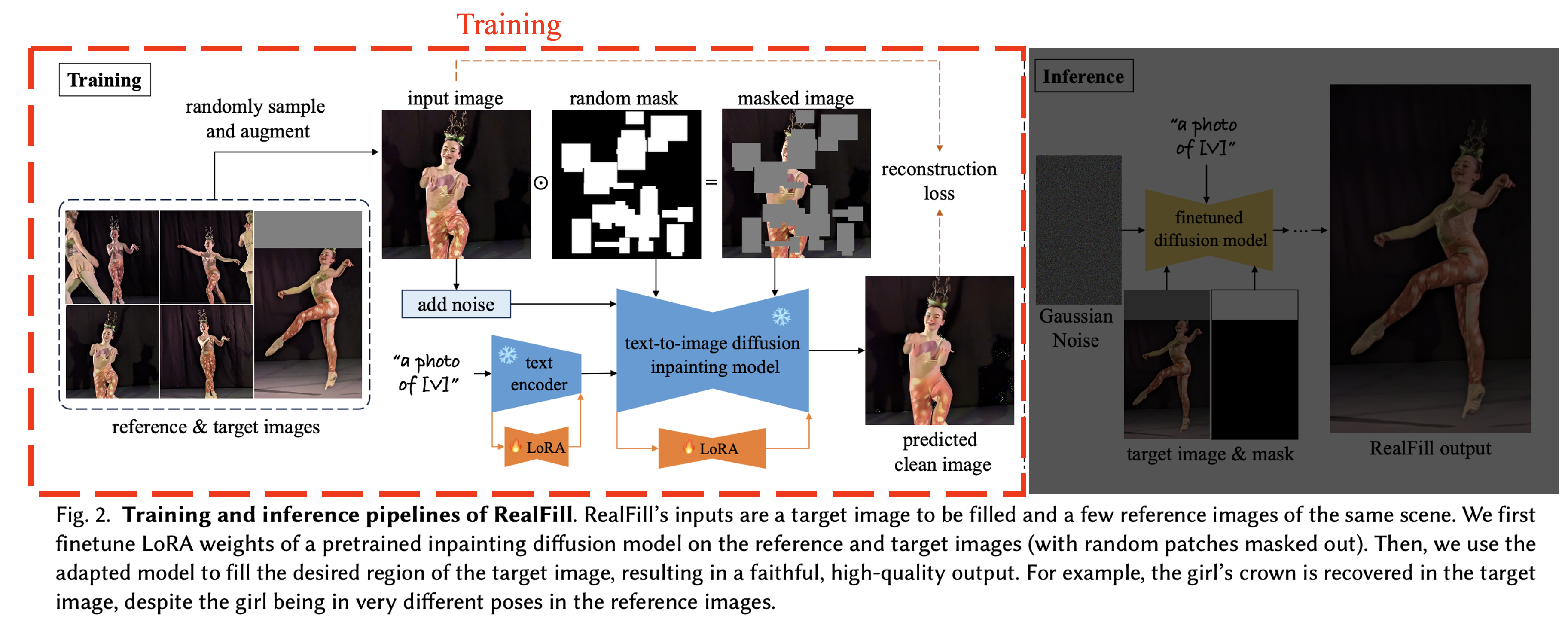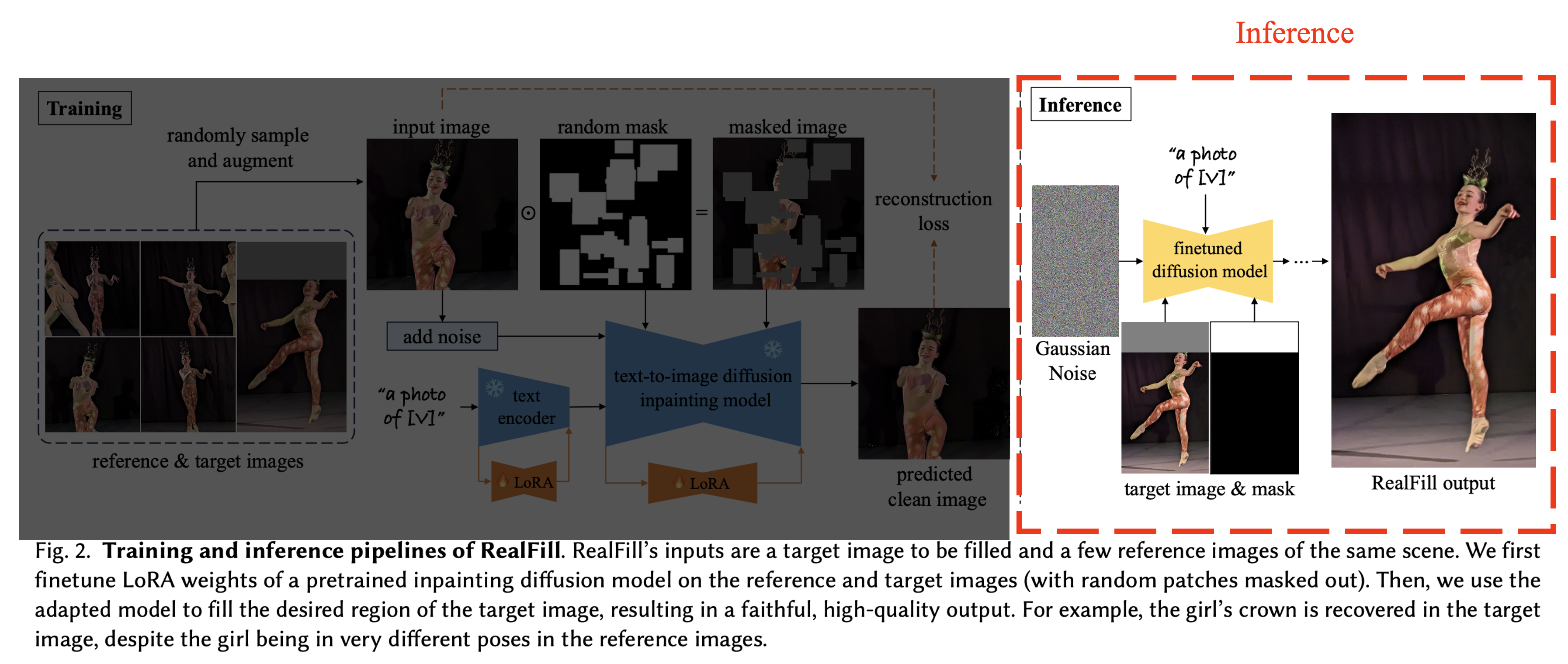 이를 해결하기 위해, 저자들은 RealFill이라는 간단하지만 효과적인 접근 방식을 제안했습니다. RealFill은 먼저 T2I (text-to-image) inpainting diffusion model을 참조 이미지와 목표 이미지에 대해 미세 조정한 후, 적응된 모델을 사용해 누락된 영역을 복원합니다.
