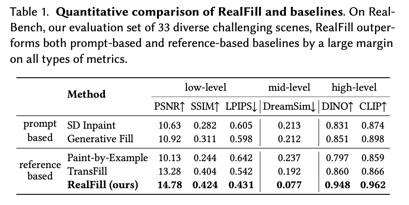 Table 1의 결과에서 RealFill이 모든 평가 지표에서 타 모델보다 크게 뛰어난 성능을 보였습니다.
