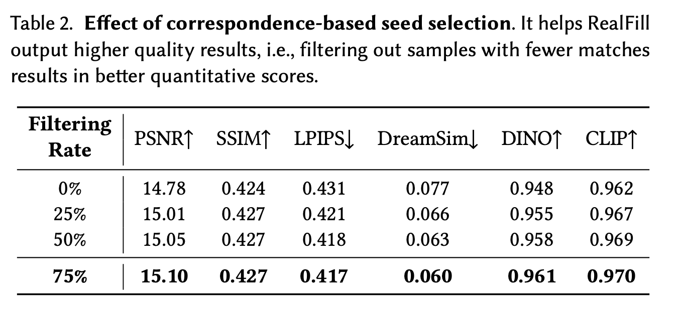 Correspondence-Based Seed Selection의 효과를 평가하기 위해, RealFill이 생성한 샘플을 일치하는 keypoint의 수에 따라 순위를 매겼고, 하위 일정 비율의 샘플을 제거했습니다. Table 2에 따르면, 상위 75%만 남겼을 때 필터링을 하지 않았을 때보다 더 나은 결과를 보였다고 합니다.