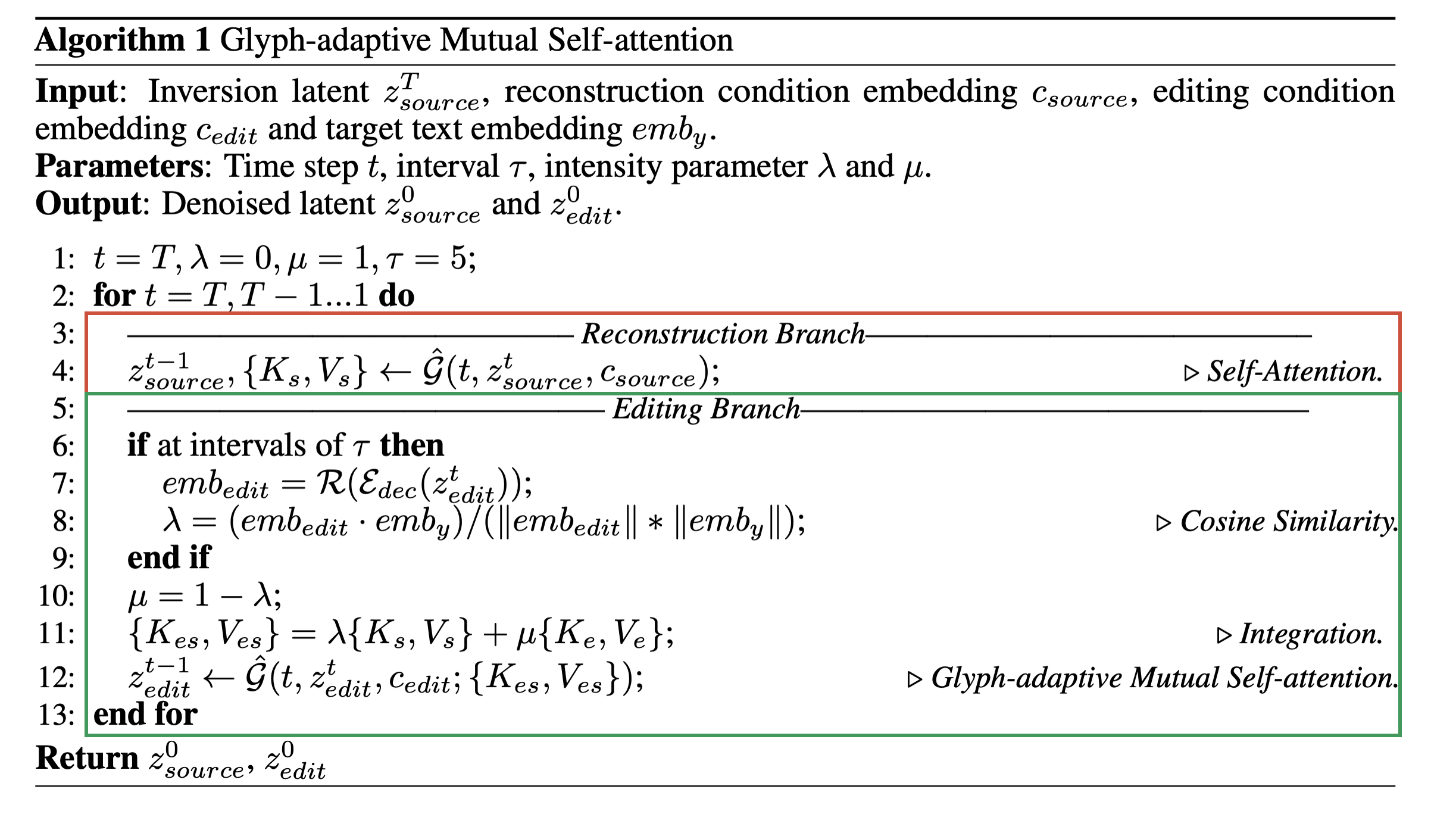 Diffusion-based STE 모델을 사용하면 때때로 의도치 않은 color deviation, texture degradation이 발생했다고 합니다. 저자들은 이런 문제의 원인을 denoising 과정에서 축적된 오차, training, inference set의 domain gap 때문이라고 주장합니다. 이를 해결하기 위해 저자들은 Source image의 prior를 injection하는 방법론인 Glyph-adaptive Mutual Self-Attention mechanism(GaMuSa)를 제안합니다.
