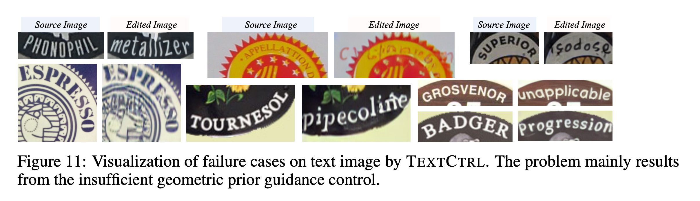 • Challenging arbitrary shape text editing : 초승달 모양 간판이나 원형 아이콘과 같은 복잡한 기하학적 속성을 가진 텍스트는 스타일 참조만으로 분리하는 데 어려움을 겪었다고 합니다.