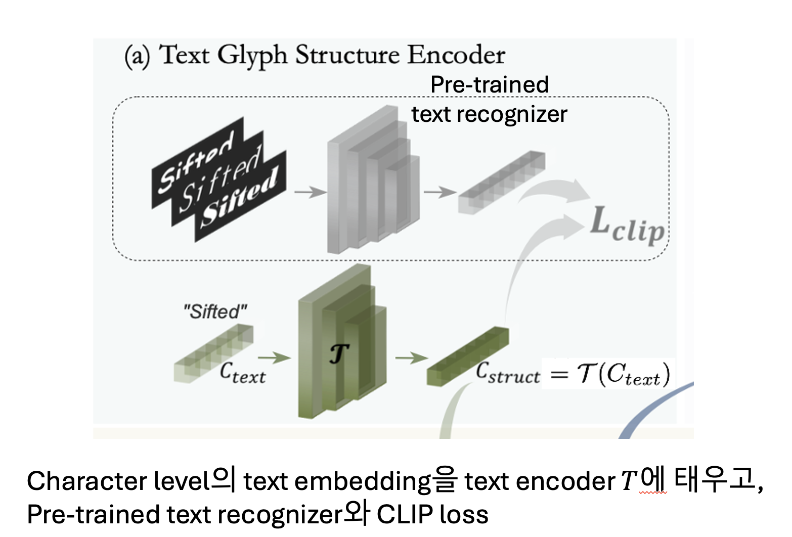 STE에서 이상적인 text encoder는 semantic 정보를 활용하지 않고 glyph structure에 기반한 encoding을 하는 것입니다. 예를들어 \(C_{text} = "Sifted"\)가 있으면, text encoder \(\mathcal{T}\)는 각 glyph structure \("S", "i", "f", "t", "e", "d"\)를 아는 것입니다.
