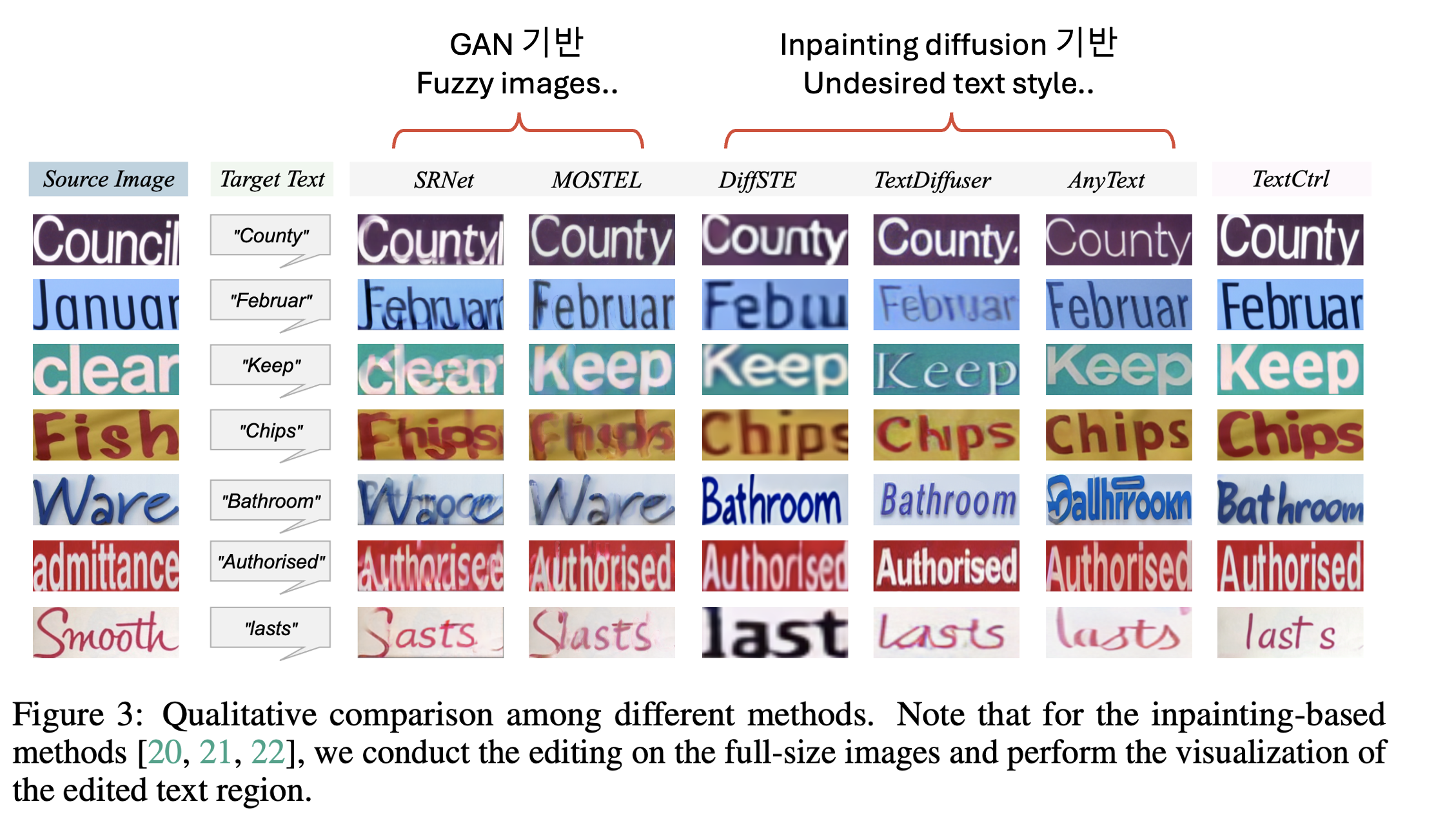 • Diffusion 기반 방법: inpainting manner로 전체 크기 이미지를 처리하며, 마스크된 타겟 텍스트 영역을 입력으로 사용.